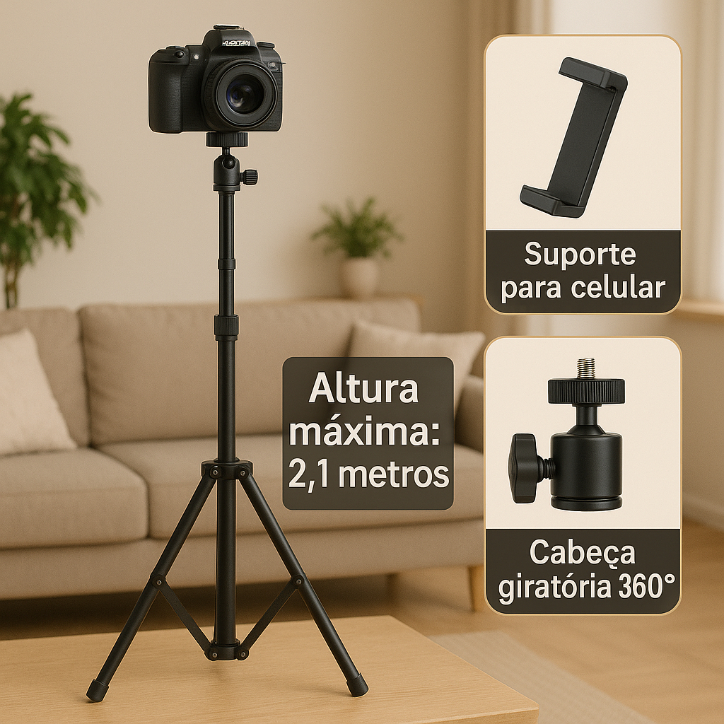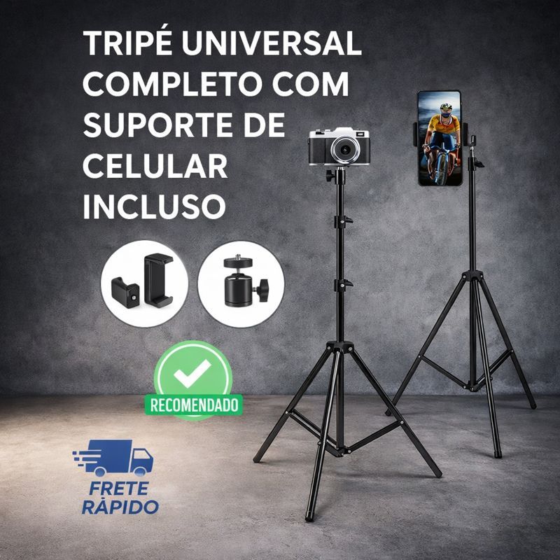 Tripé universal com suporte para celular - comp. Câmera Ring Light Iluminação Profissional 210cm