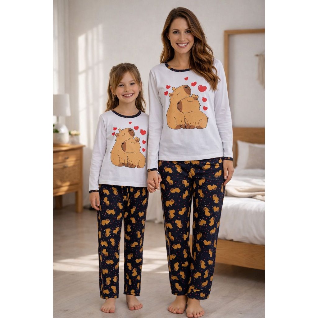 Kit 2 Pijamas Inverno Longo Mãe E Filha Manga Longa e Calça Desenho Capivara