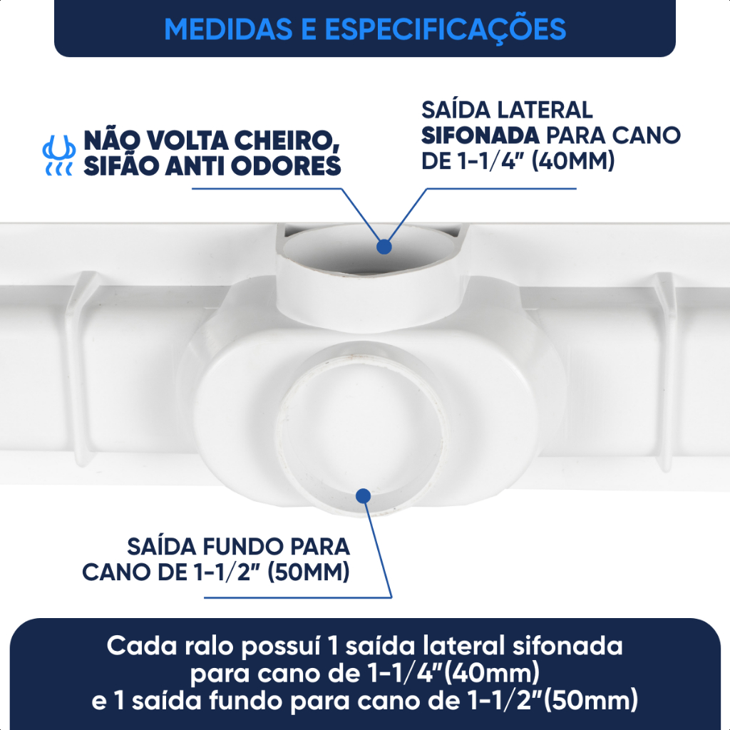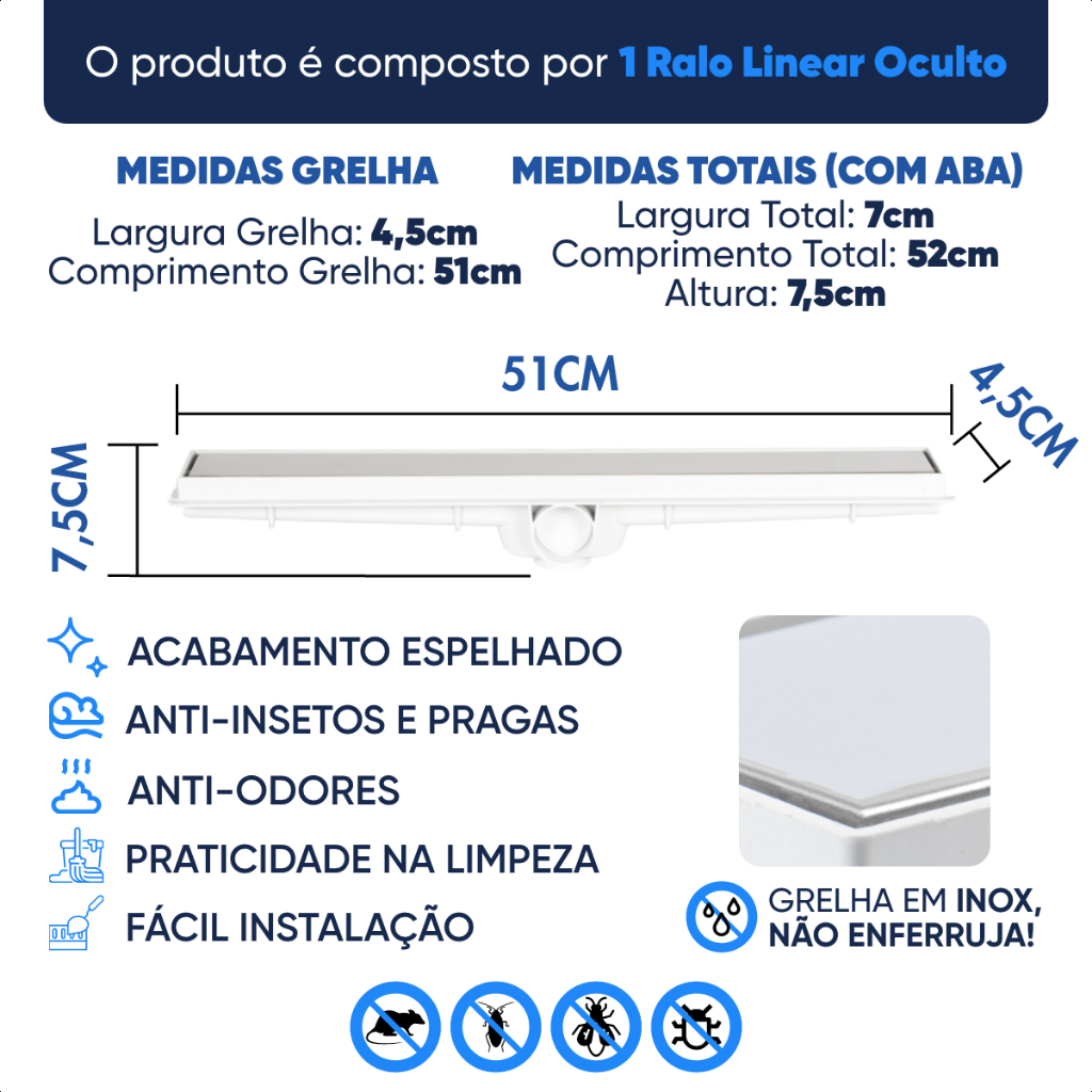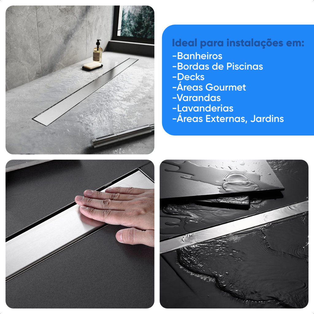 Ralo Linear Oculto Invisível 5cm com Grelha em Inox e Caixa Coletora Sifonada 50cm 70cm 80cm 90cm