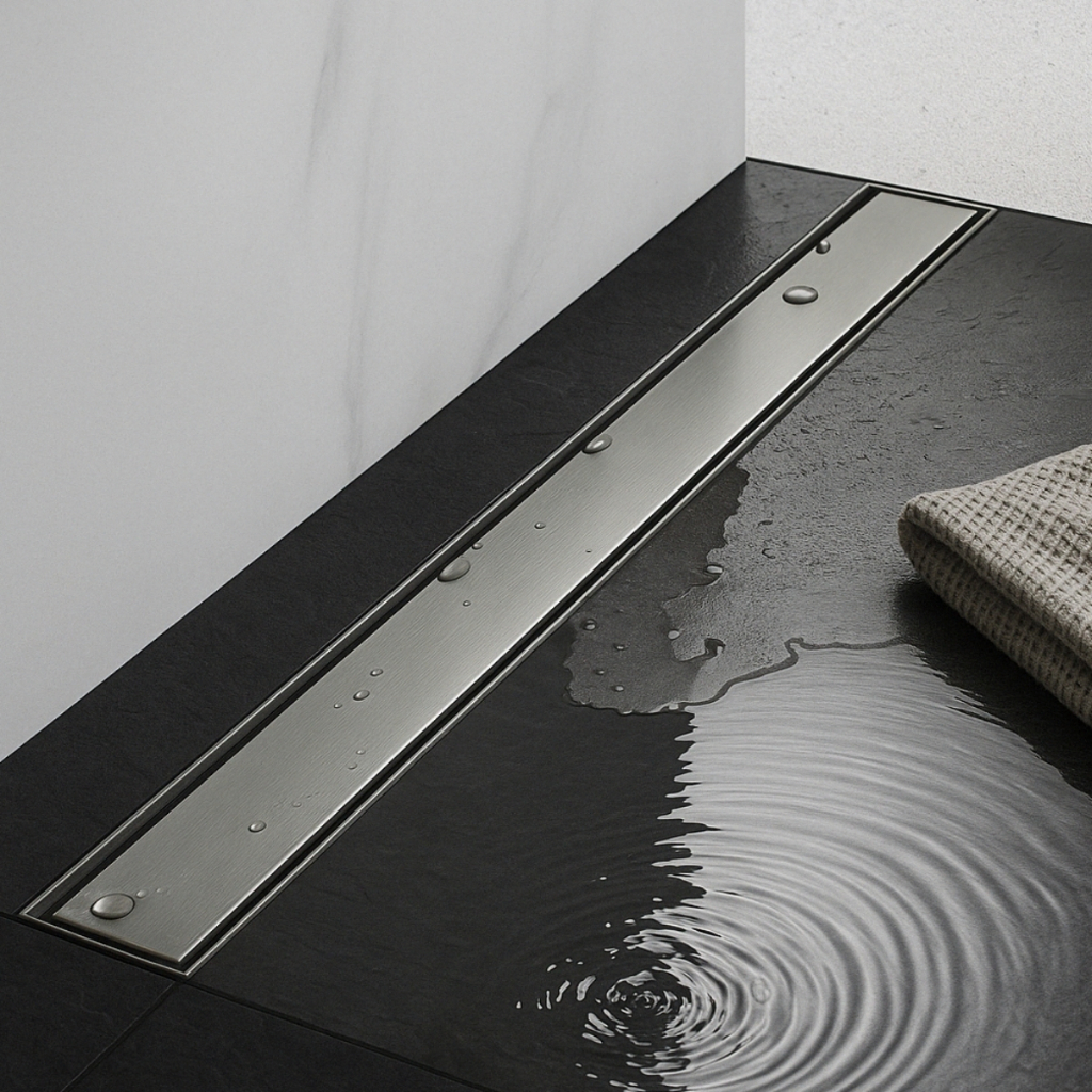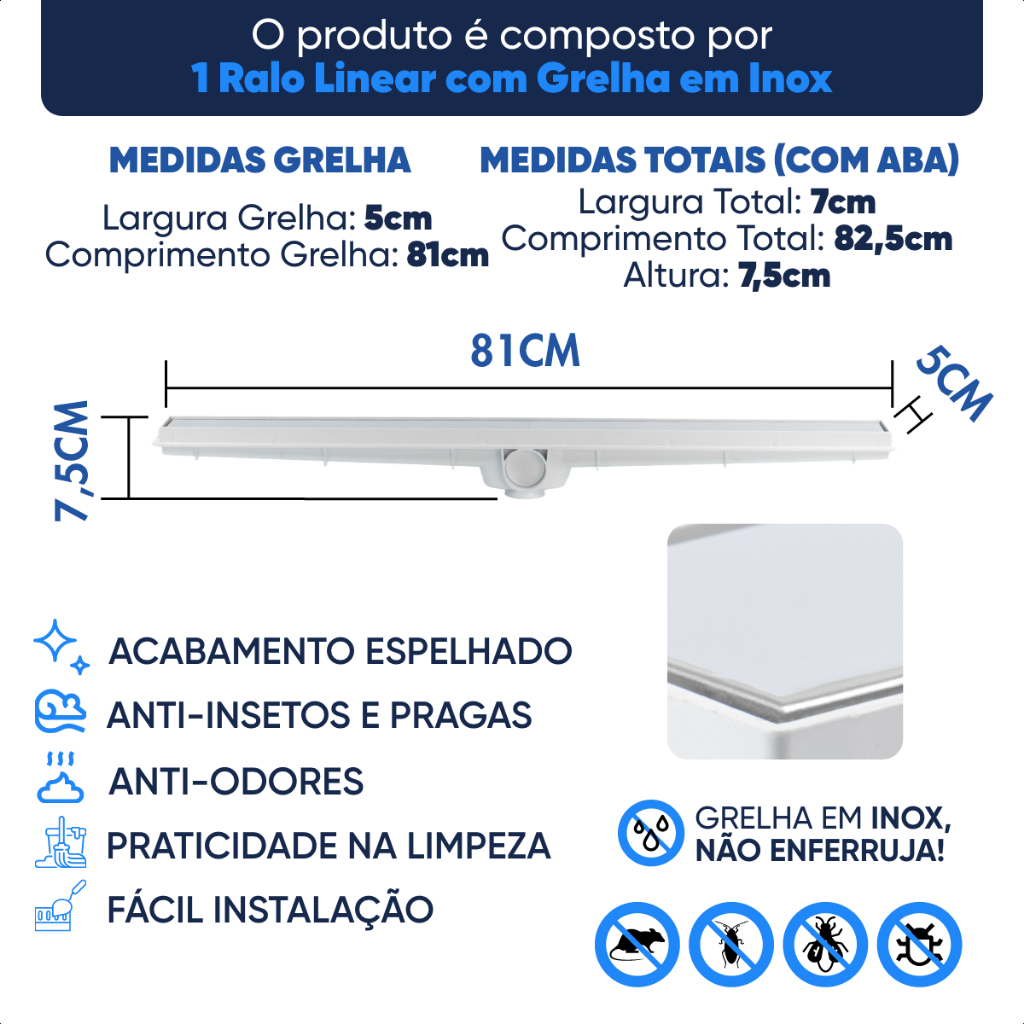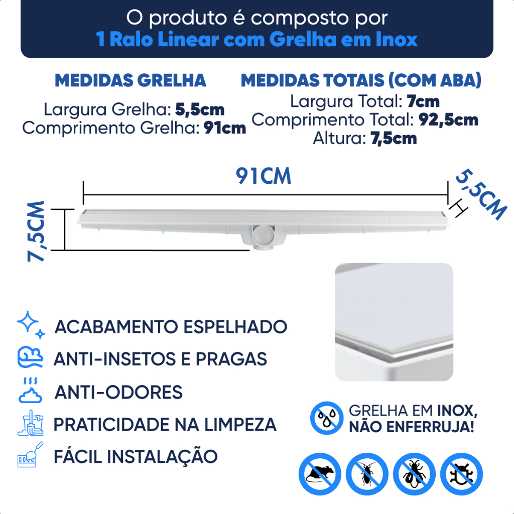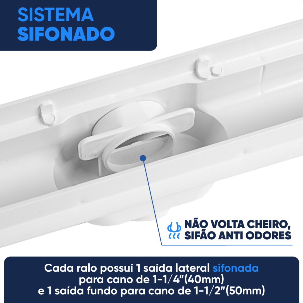 Ralo Linear Oculto Invisível 5cm com Grelha em Inox e Caixa Coletora Sifonada 50cm 70cm 80cm 90cm