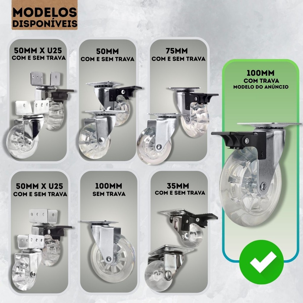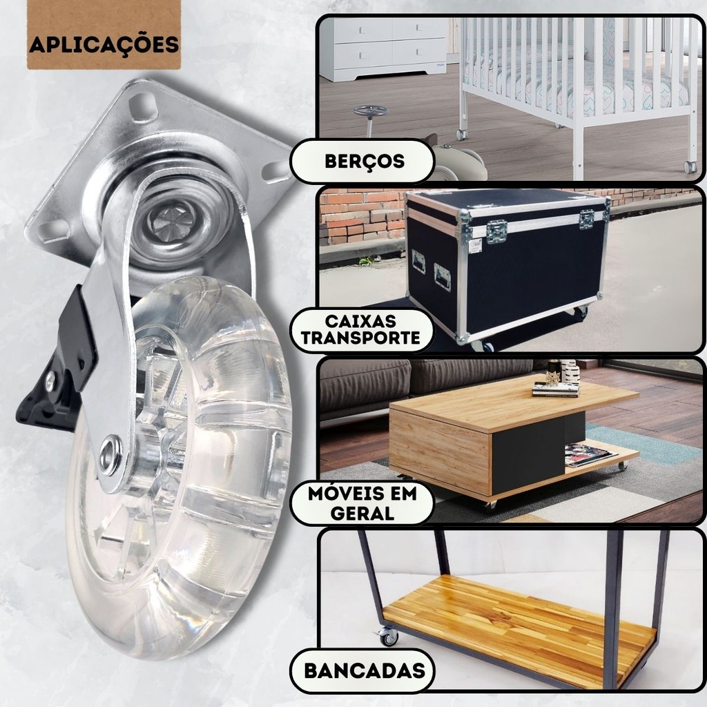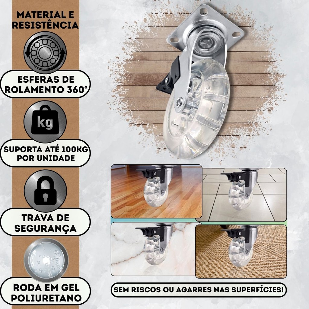 Kit 4 Rodízio Giratório 100mm Gel PU Transparente 400kg Com Trava Rodinha Anti Risco e Ruído Móveis Escritório Roda