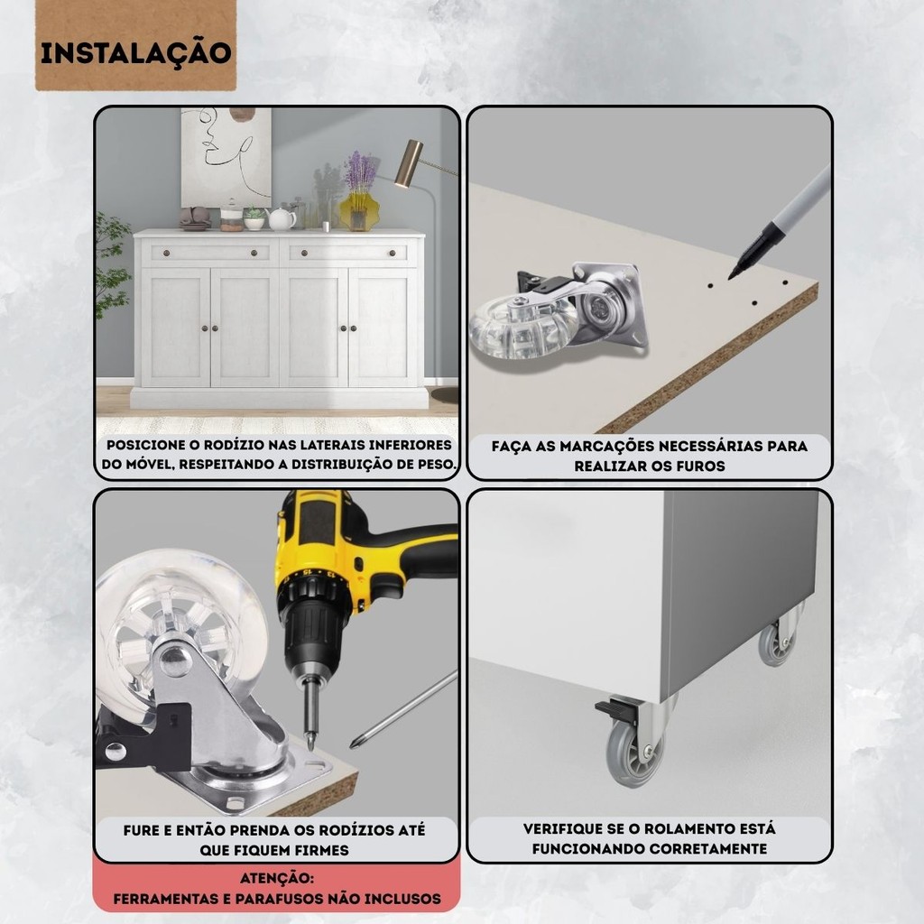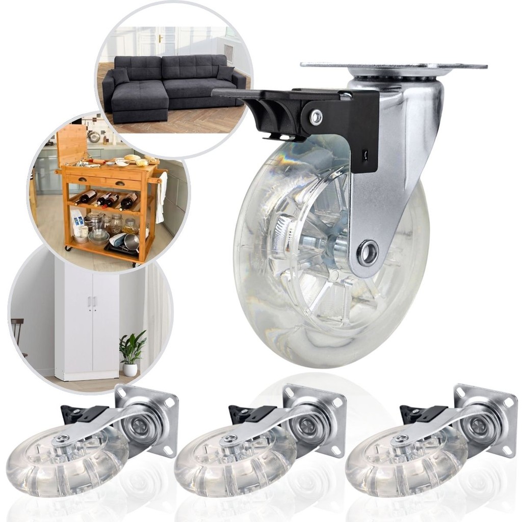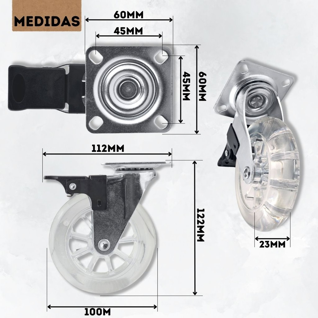 Kit 4 Rodízio Giratório 100mm Gel PU Transparente 400kg Com Trava Rodinha Anti Risco e Ruído Móveis Escritório Roda