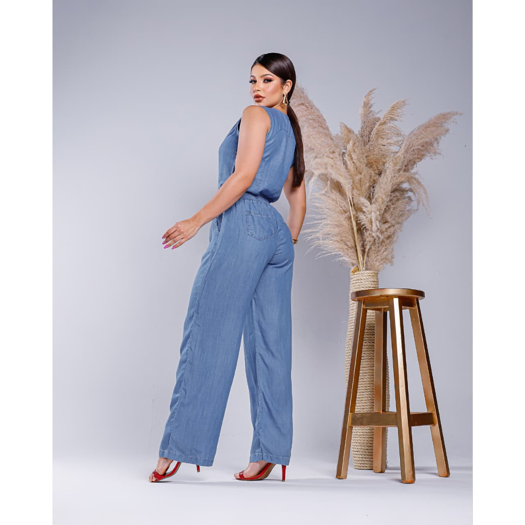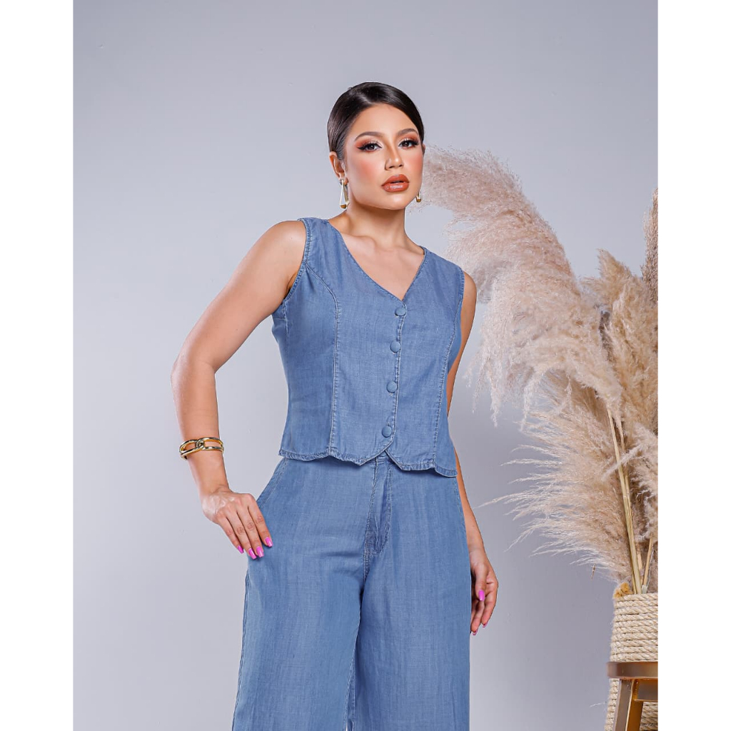 Conjunto Feminino Jeans Liocel Colete e Calça Wide Leg Pantalona Elastico Atrás, Conforto e Estilo Todas as Ocasiões