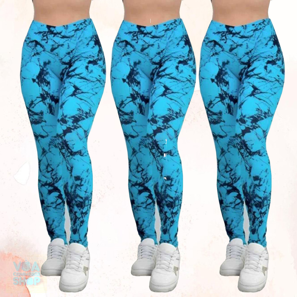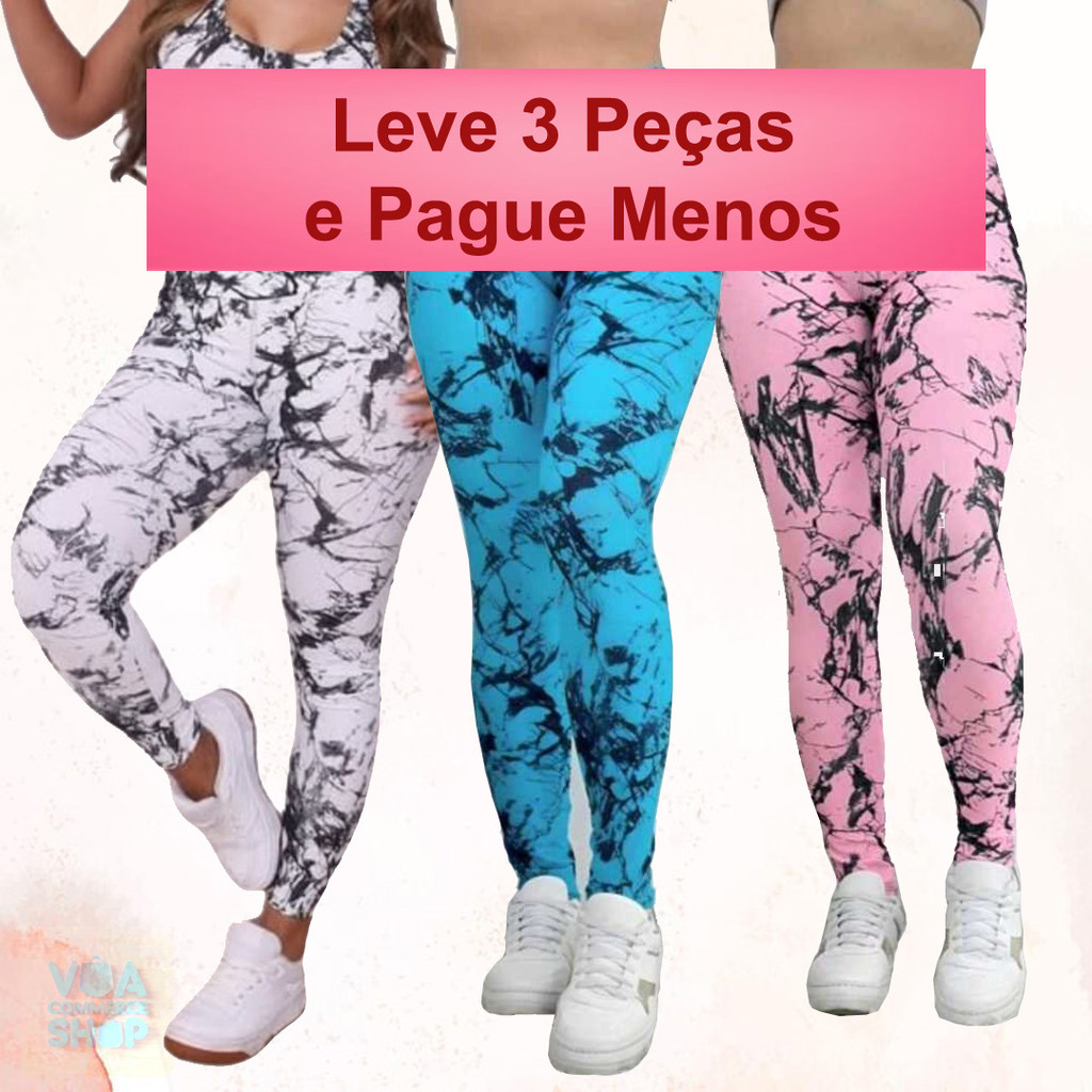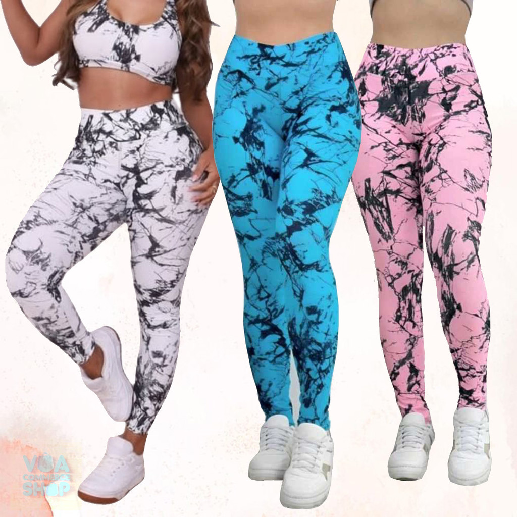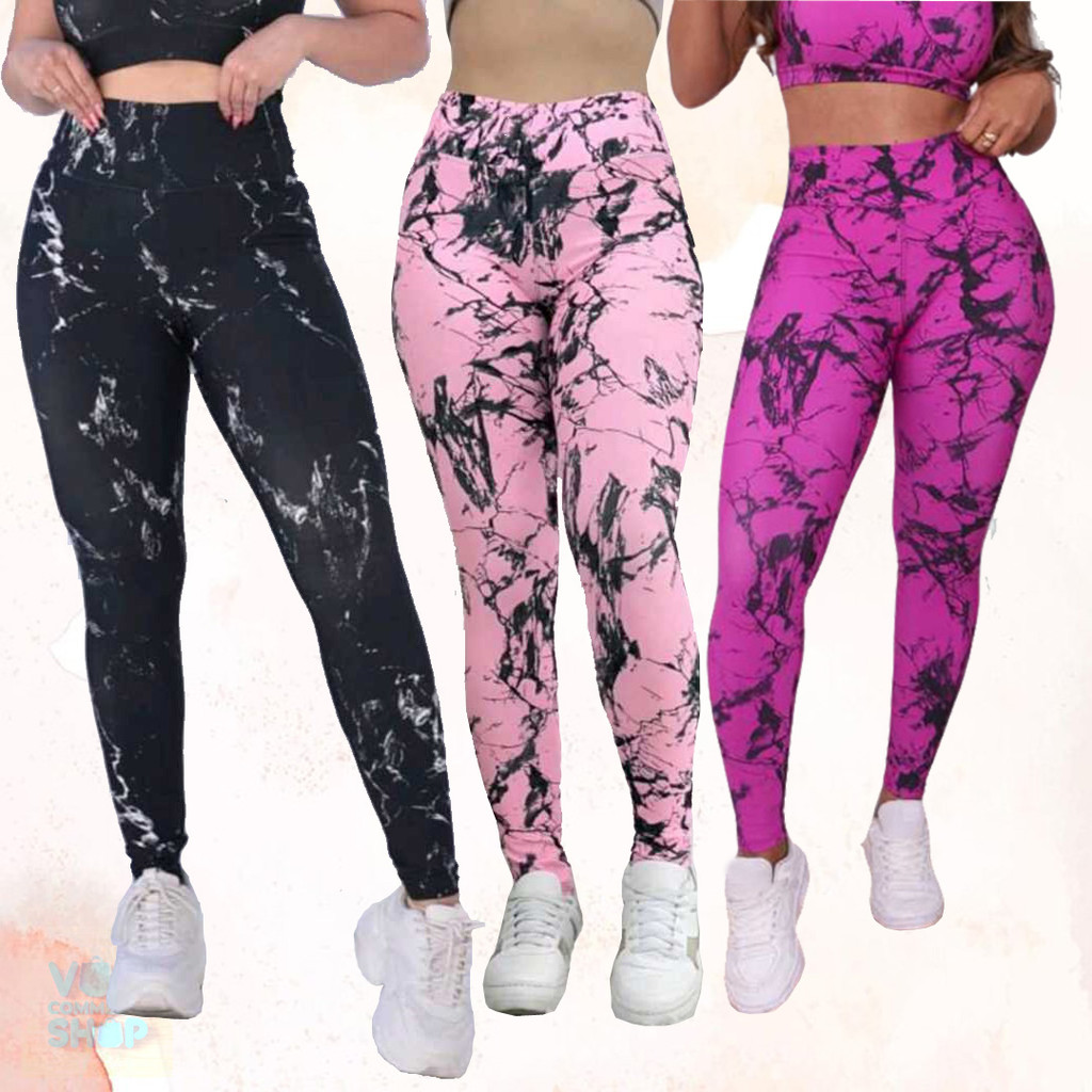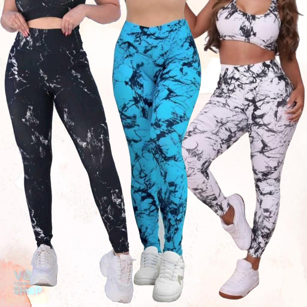 Kit 3 Calças Feminina Marmorizada Legging Fitness Academia Cintura Alta Ajuste Perfeito ao Corpo
