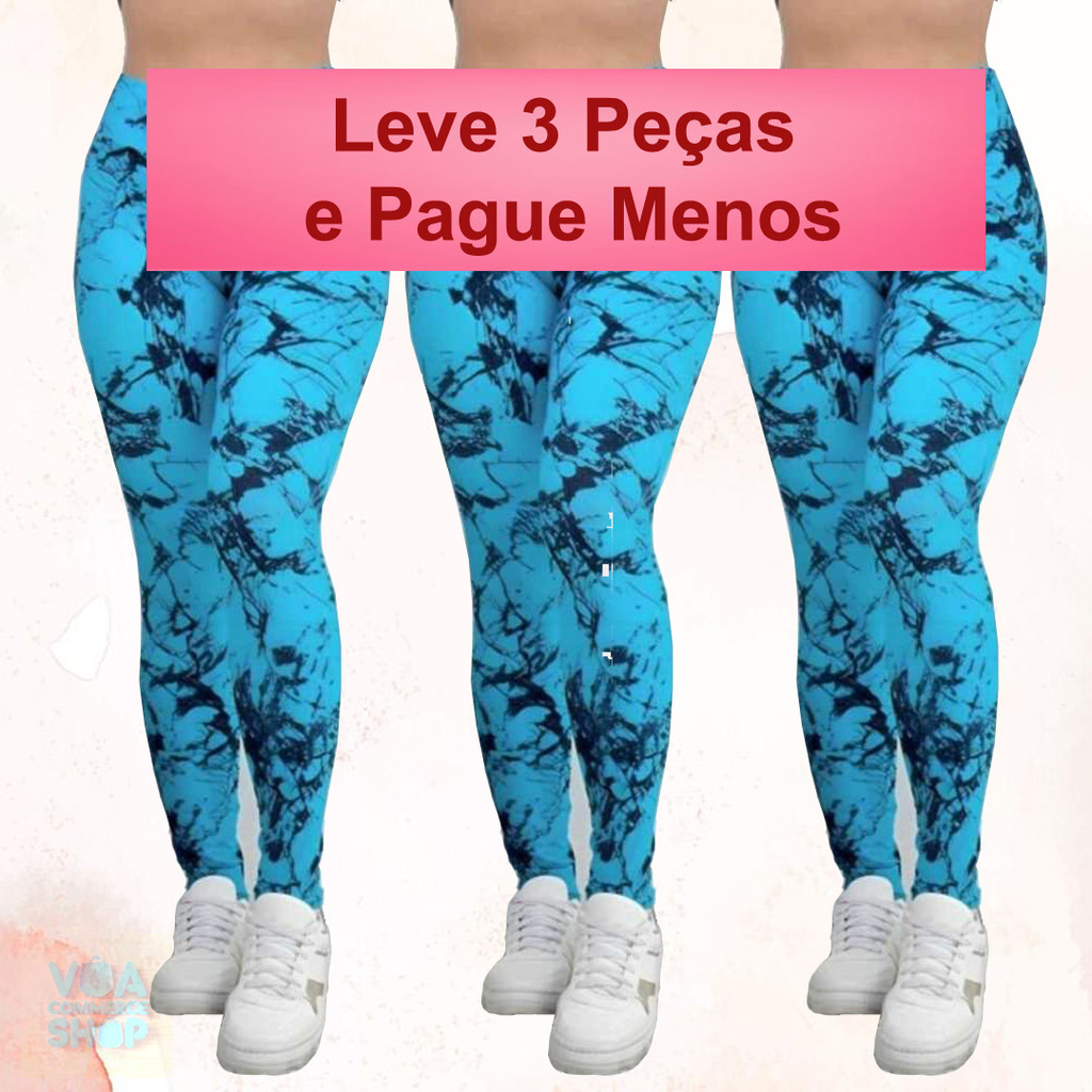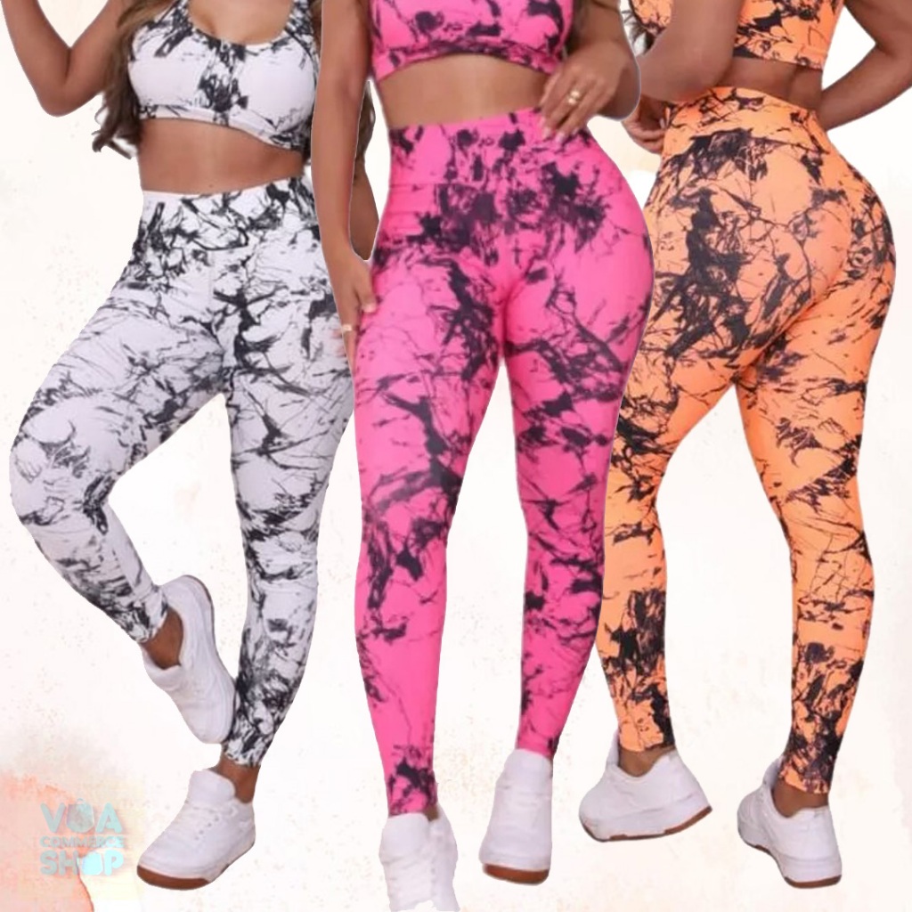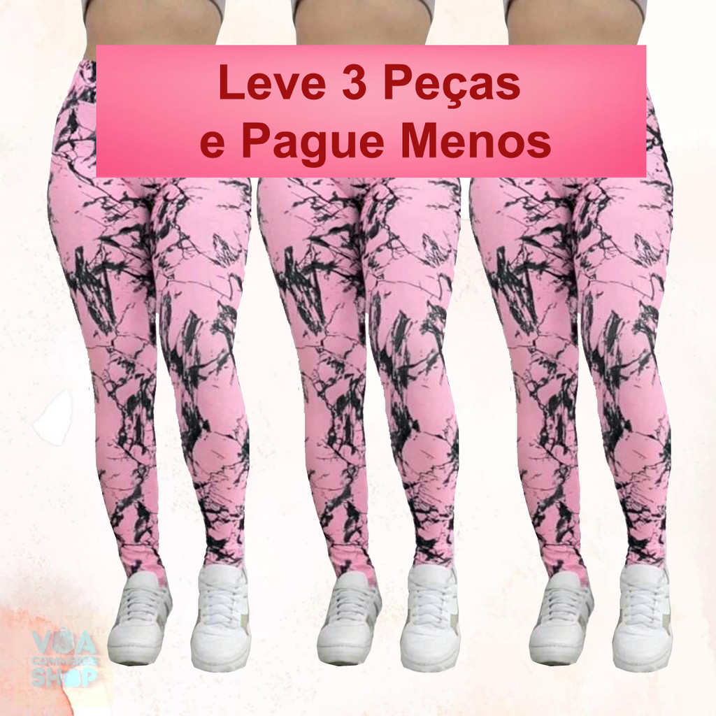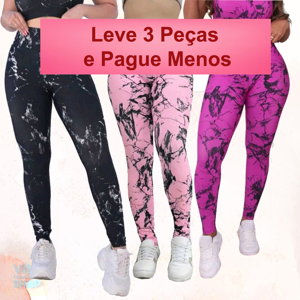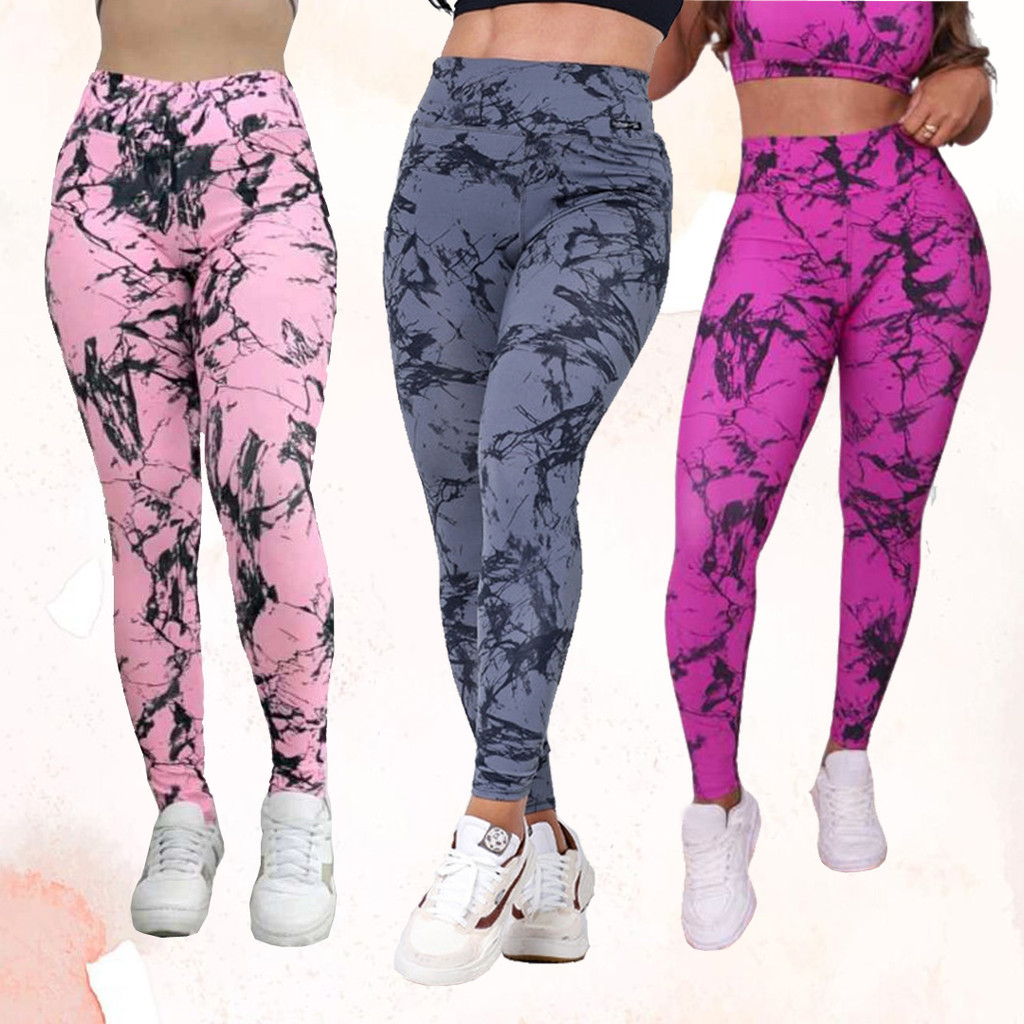 Kit 3 Calças Feminina Marmorizada Legging Fitness Academia Cintura Alta Ajuste Perfeito ao Corpo