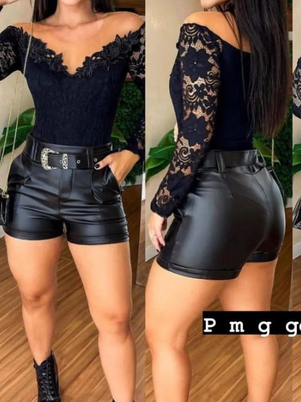 Shorts Feminino Luxo em Couro fake Cinto com Fivela