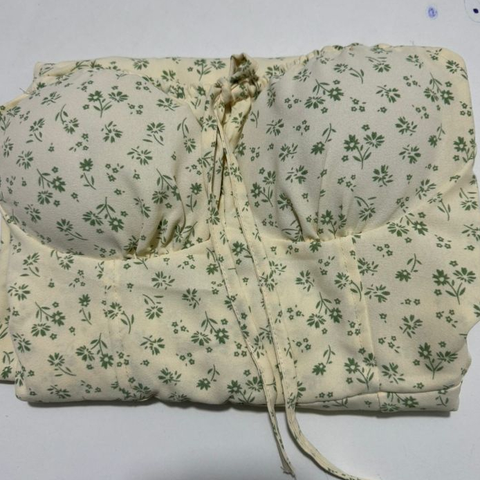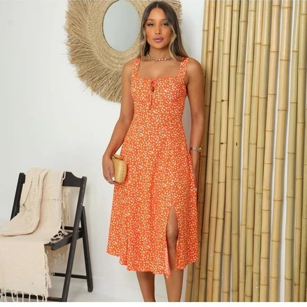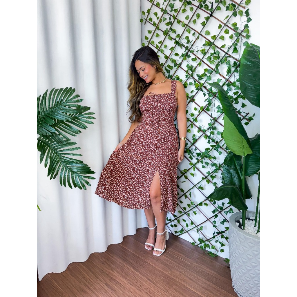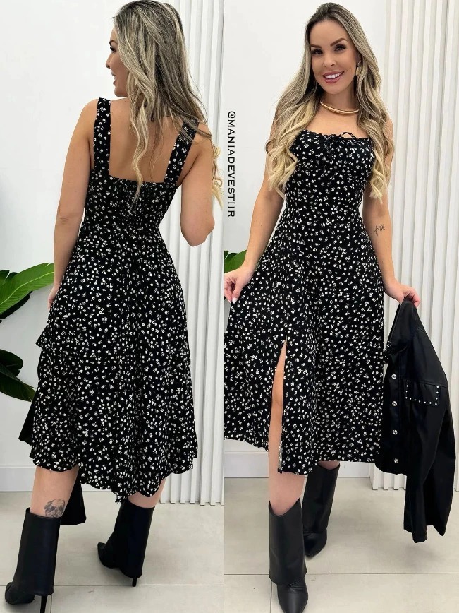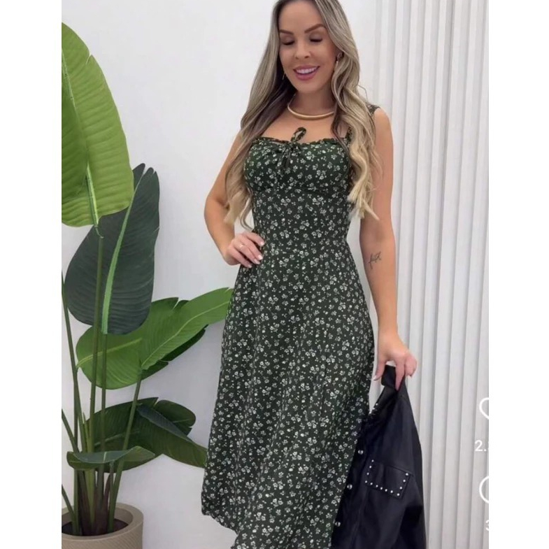 Vestido Mídi Romântico Estampado Floral com Alça e Elastex Cruzado Costa Tendencia 2025