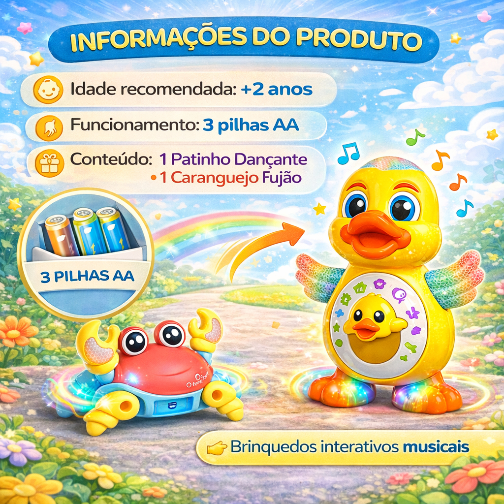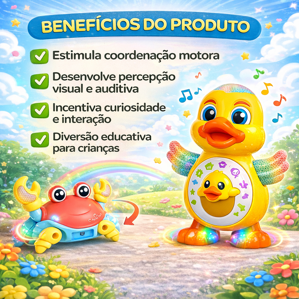 Kit Caranguejo Fujão e Patinho Dançarino Brinquedo Infantil Dançante Musical Anda e Mexe com Luz Som