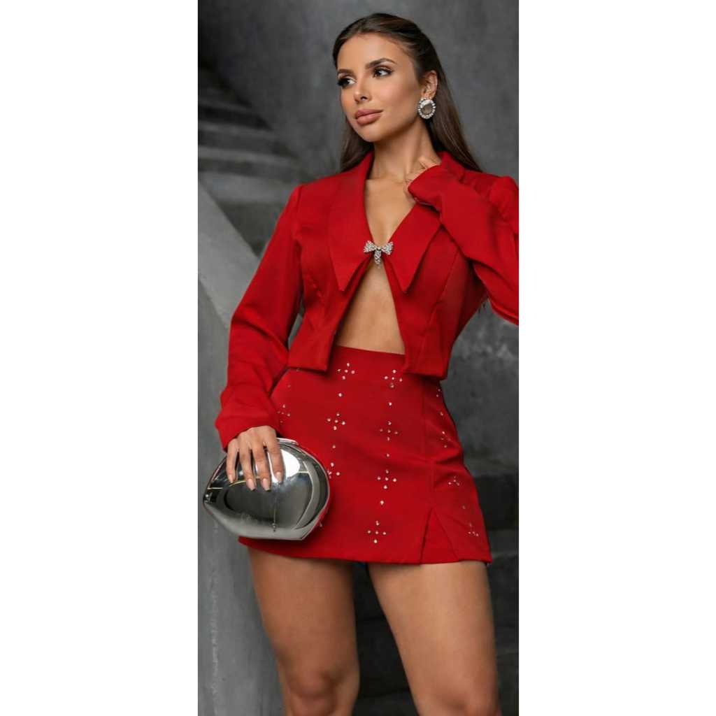 CONJUNTO ALFAIATARIA FEMININA SAIA CON SHORT CON DETALHE DE STRASS + MINI BLAZER