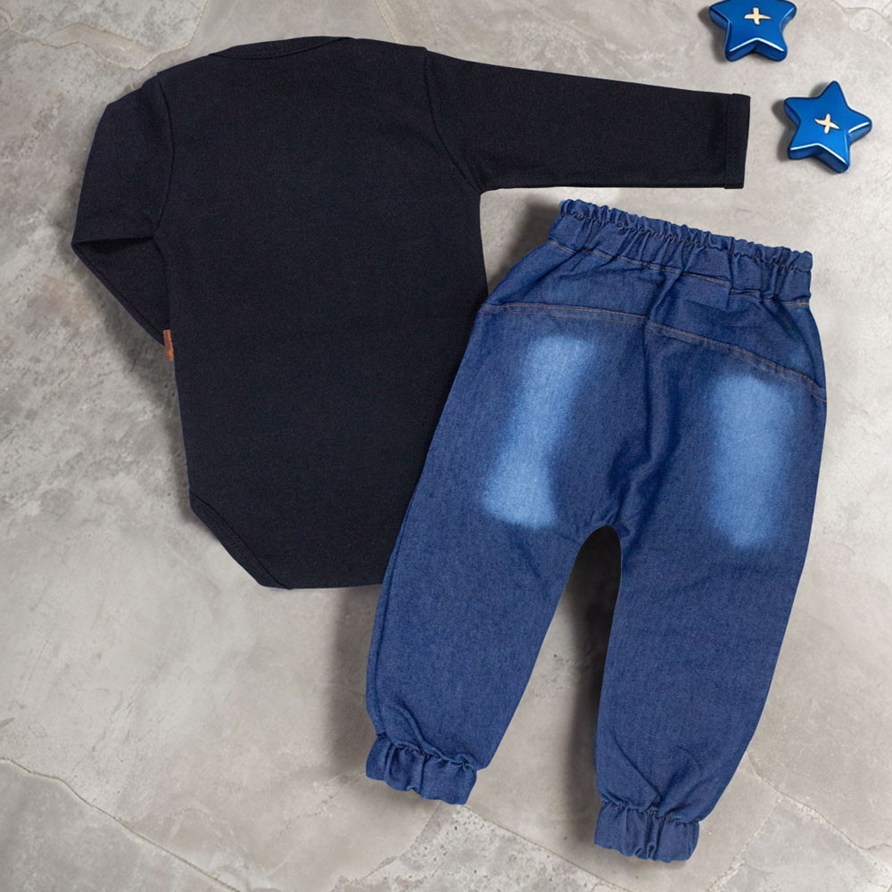 Conjunto Bebê Body Preto Bordado Urso + Calça Jeans Charmoso Infantil Menino Menina