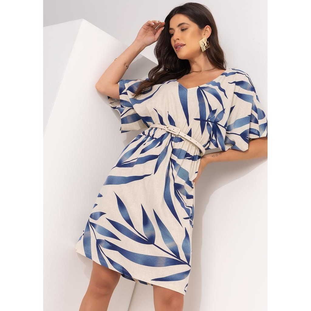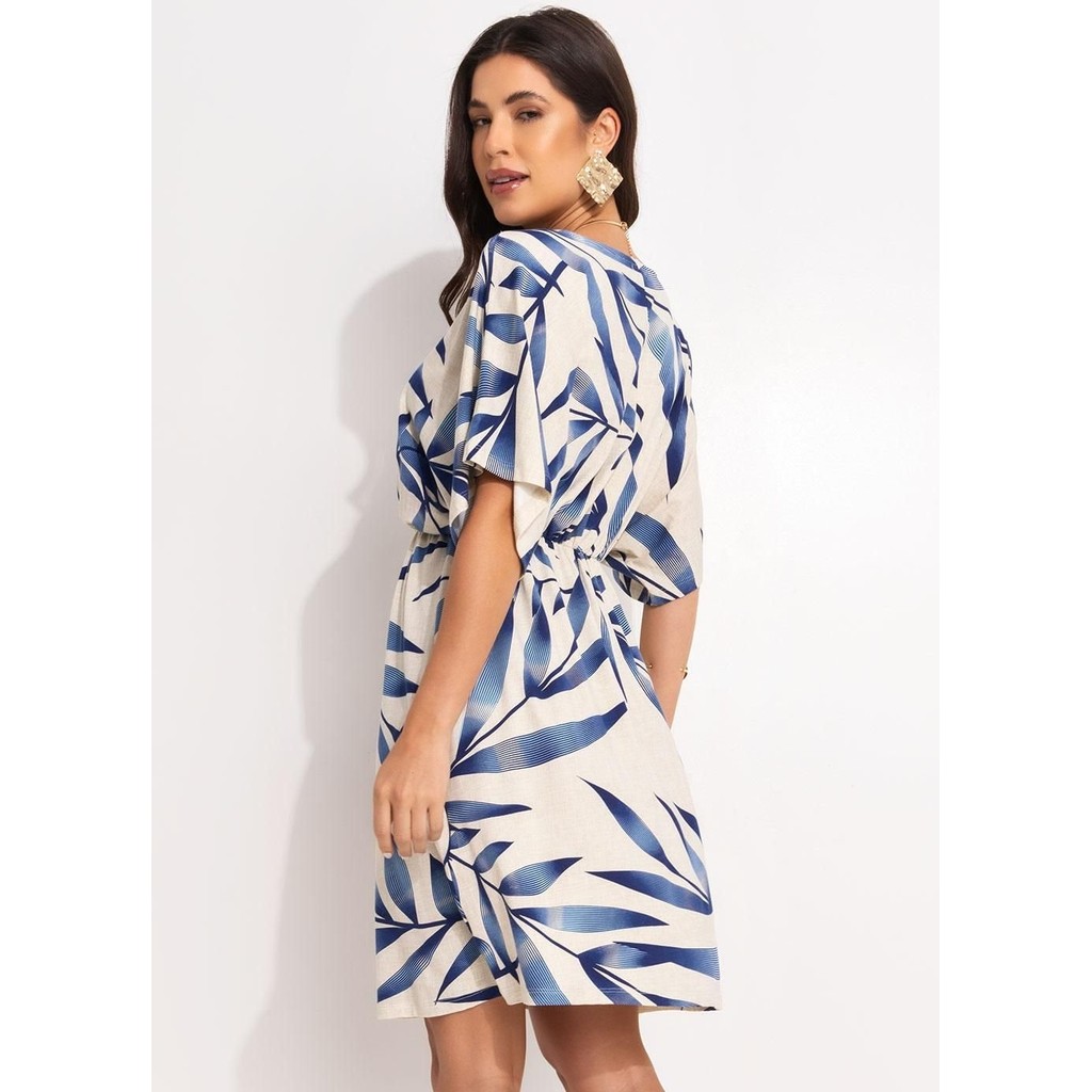 Vestido Feminino Folhagem Azul Quintess Casual Tendência