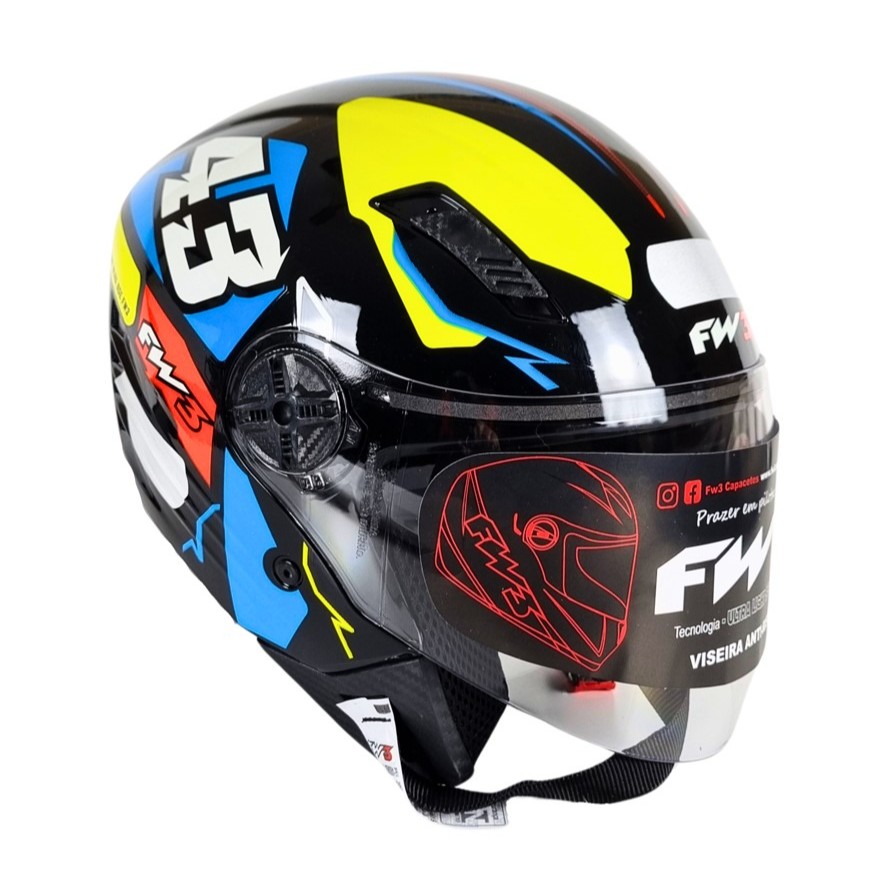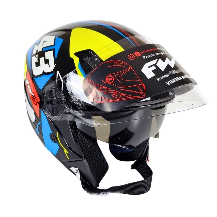 CAPACETE FW3 ABERTO COM ÓCULOS INTERNO X OPEN UP 43 AMARELO/AZUL VISEIRA SOLAR