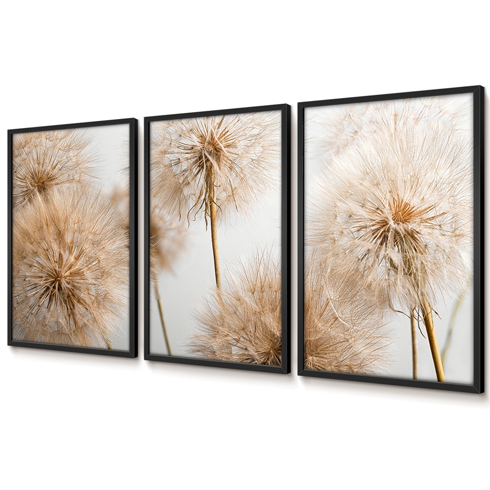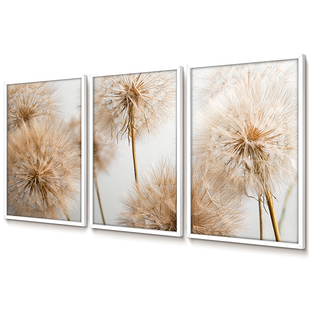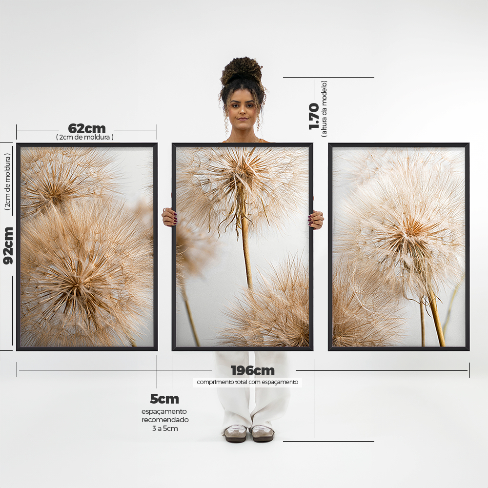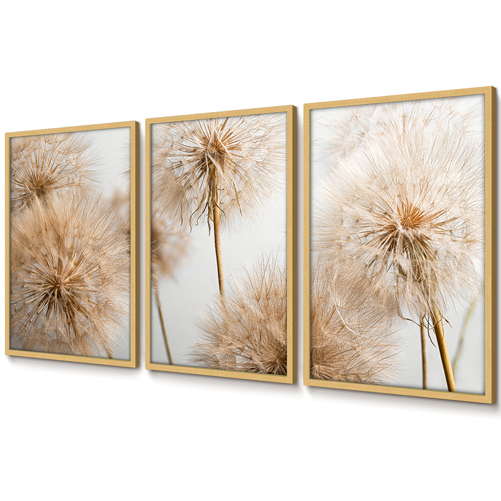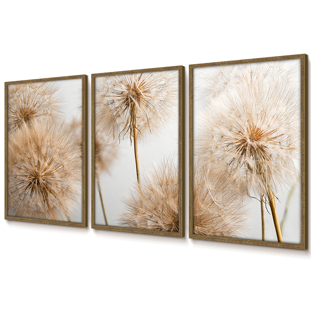 Quadros Decorativos COM MOLDURA Sala Quarto Casal Escritório Trio Dente De Leão Dourado Tom Sépia