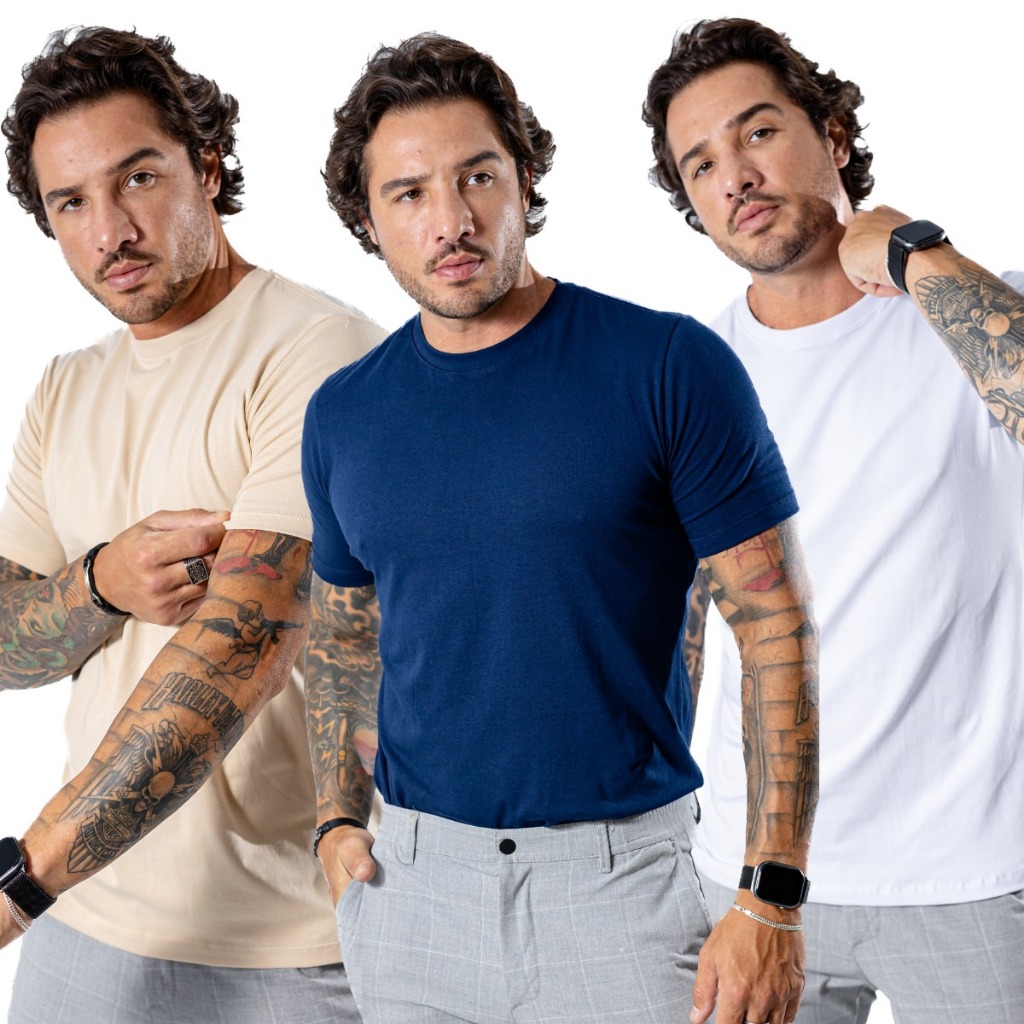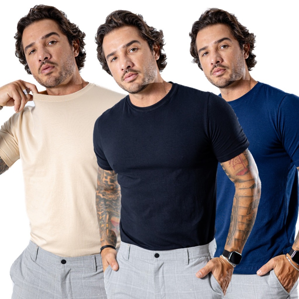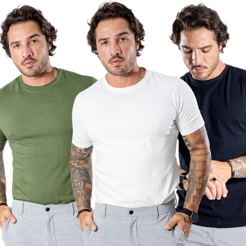 Kit 3 Camiseta Peruana Masculina Premium Algodão Pima com Elastano para Homens Preto