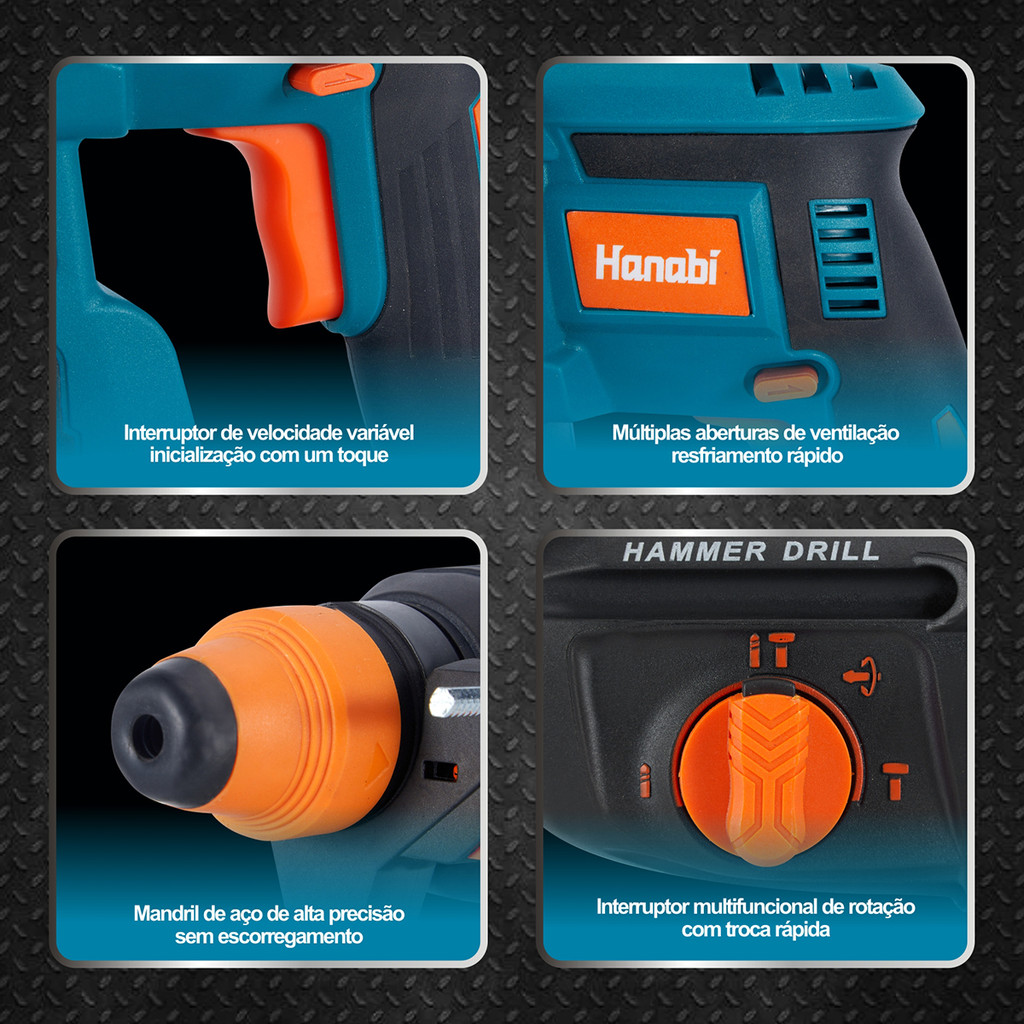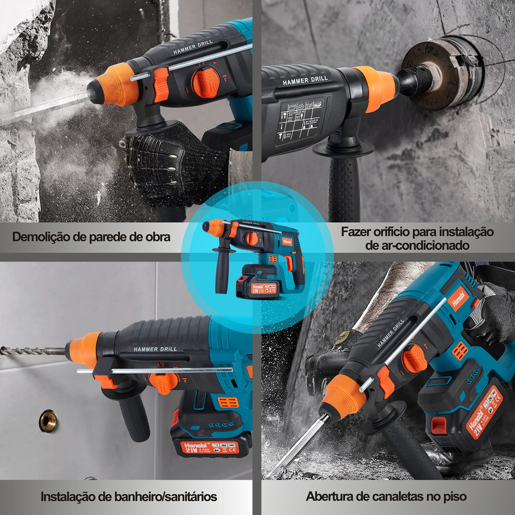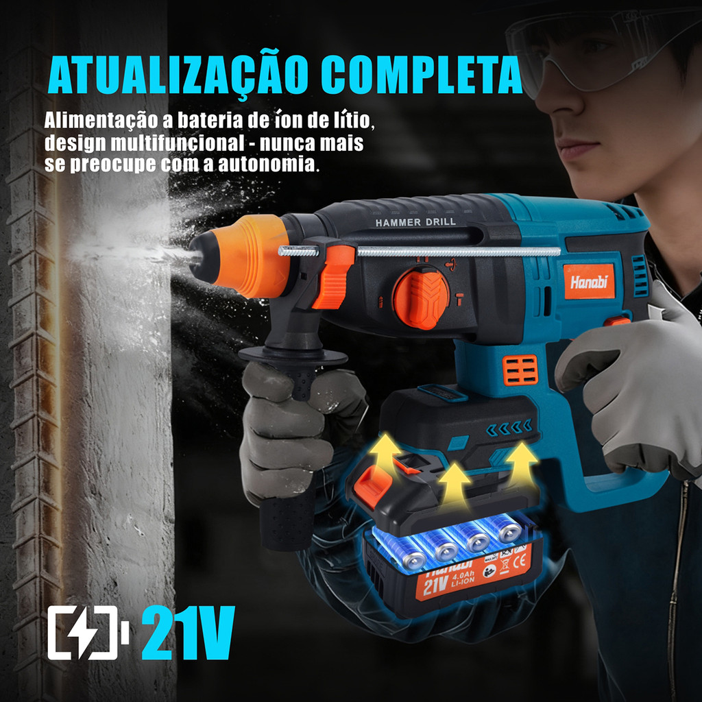 Martelete Rotativo Rompedor Hanabi 21V 4.0Ah SDS Plus 26mm Sem Fio Profissional 3 Funções 2 Baterias