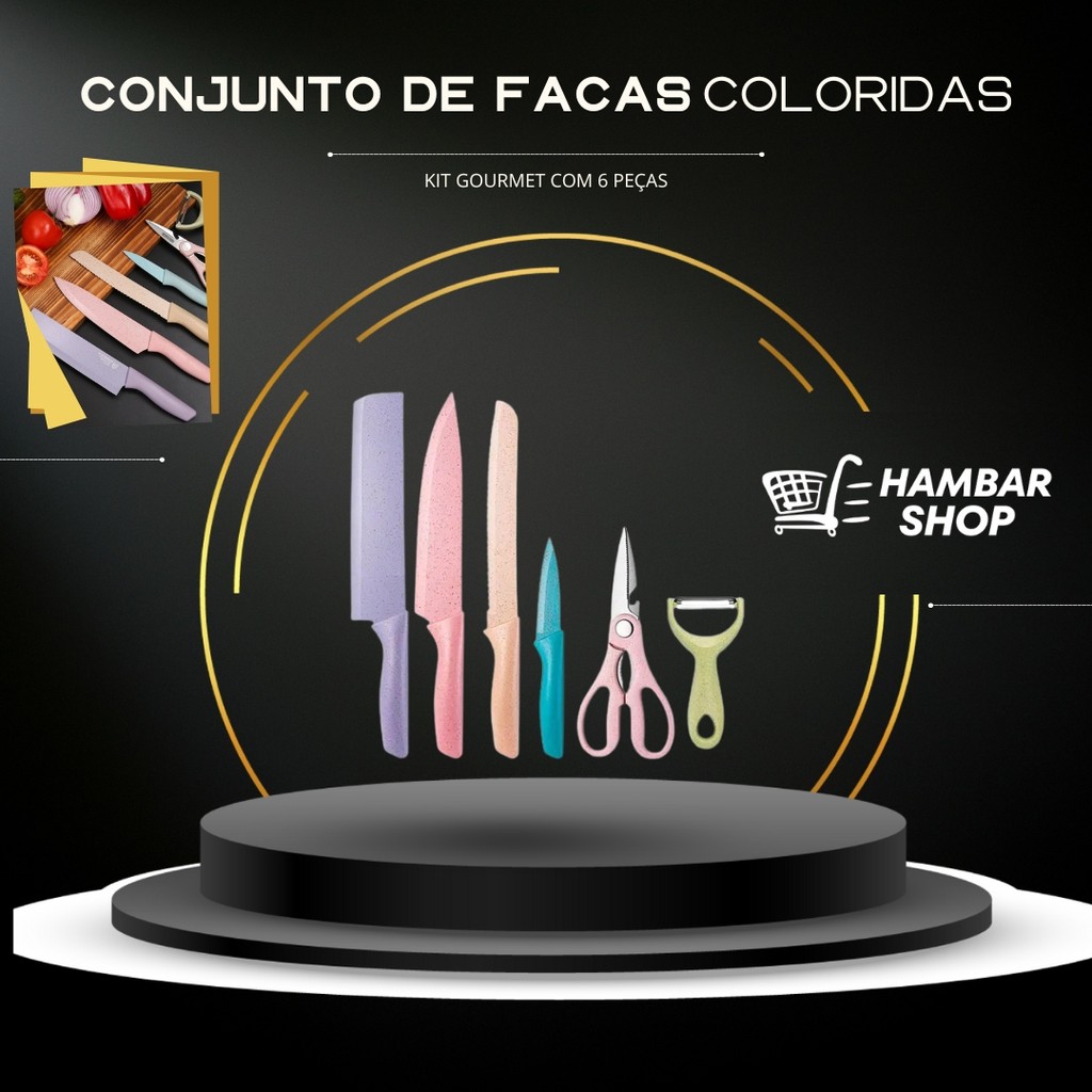 Conjunto de Facas Coloridas e Utensílios de Cozinha - Kit Gourmet com 6 Peças, Incluindo Tesoura e Descascador