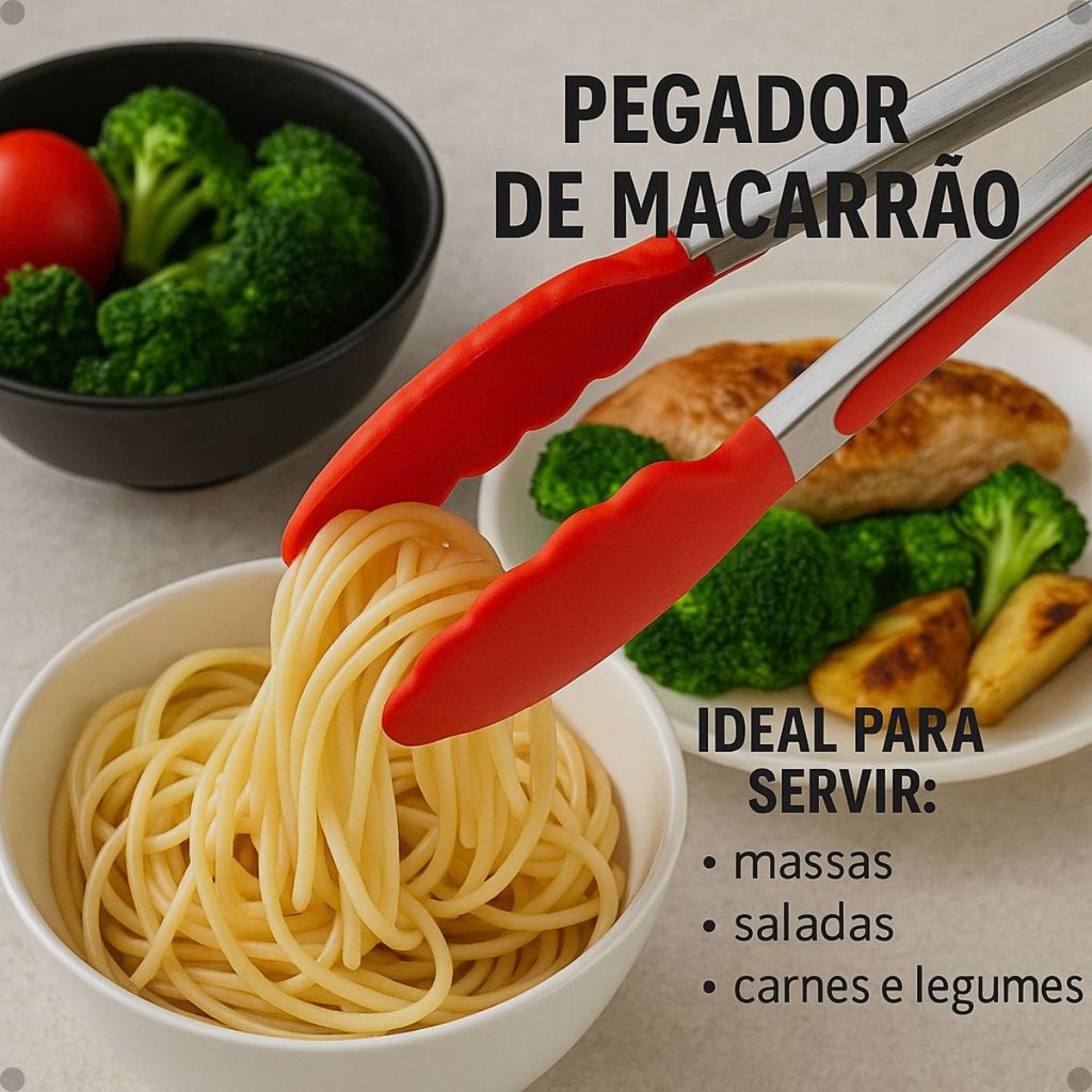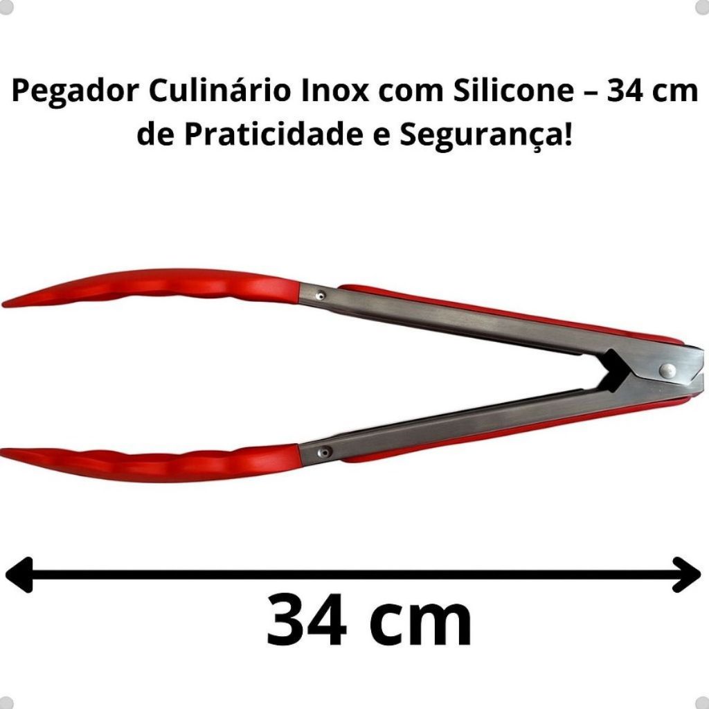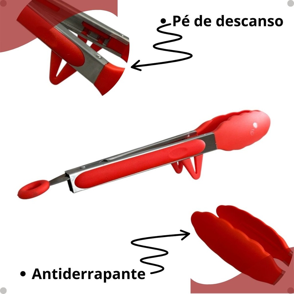Pegador Inox com Silicone Resistente ao Calor 34cm Vermelho ou Preto com Pézinho p Saladas Macarrão