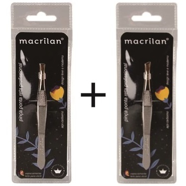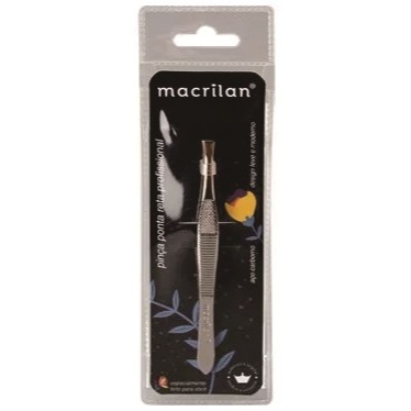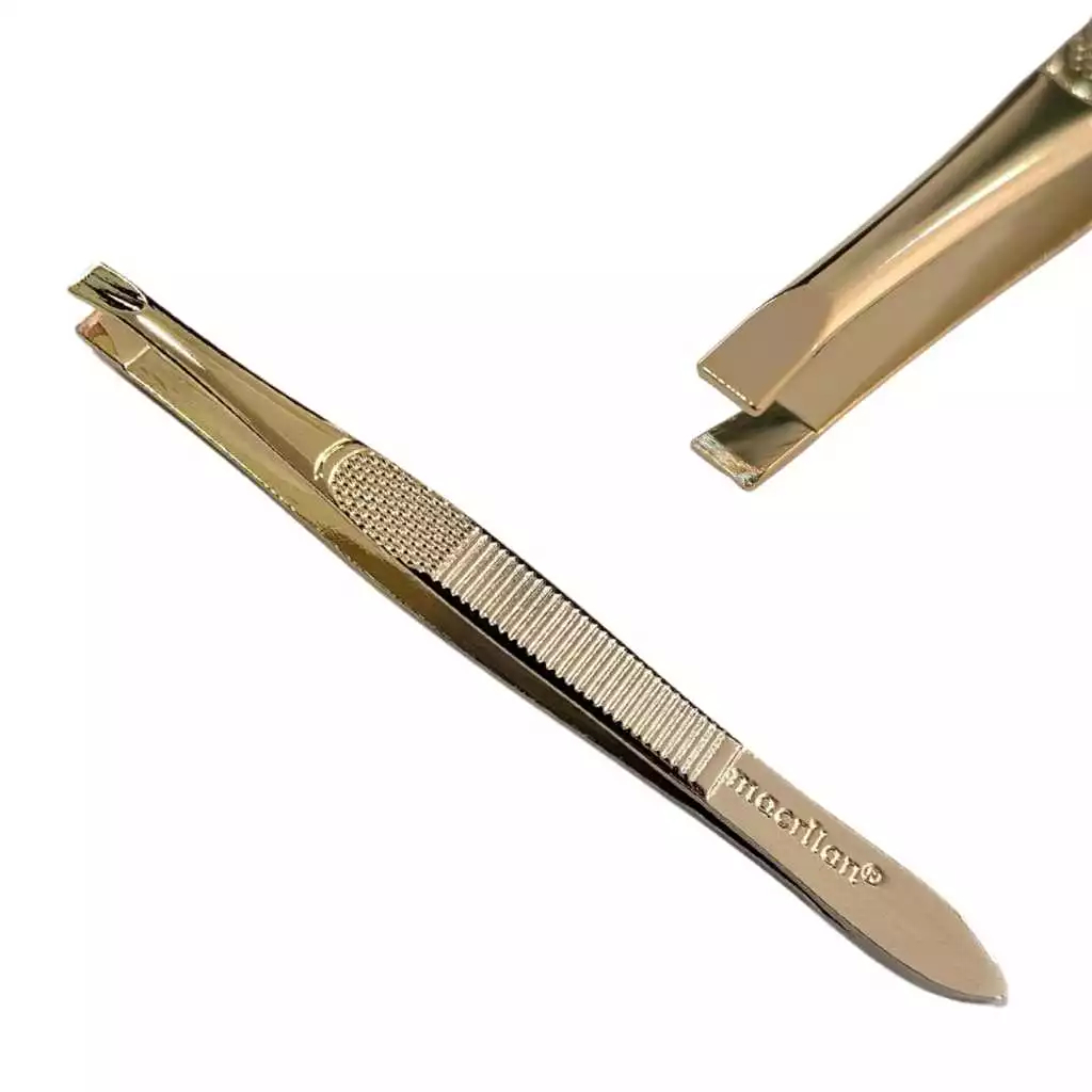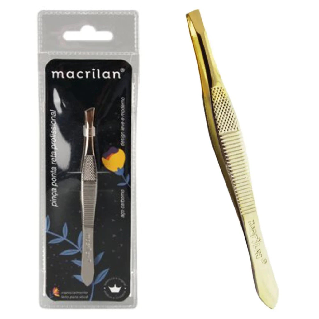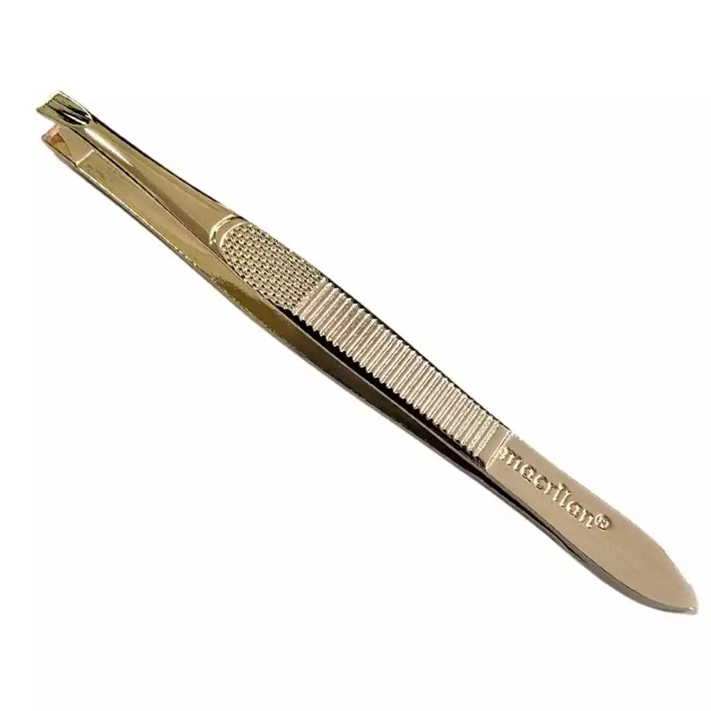 Pinça plana e angular de aço carbono dourado profissional Macrilan - para cílios e sobrancelhas