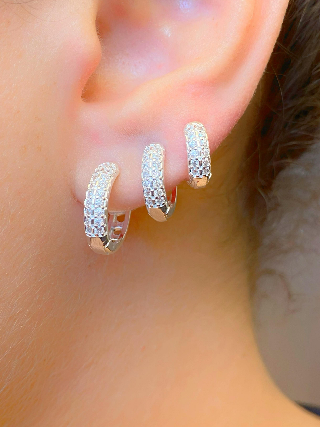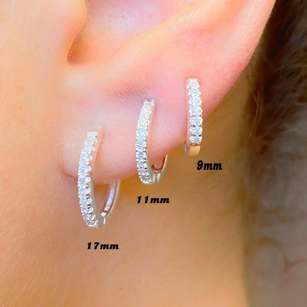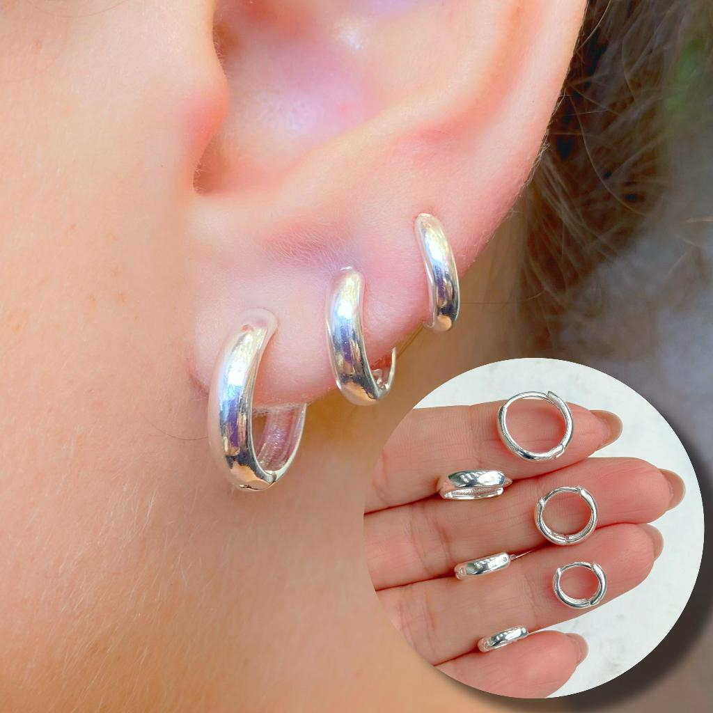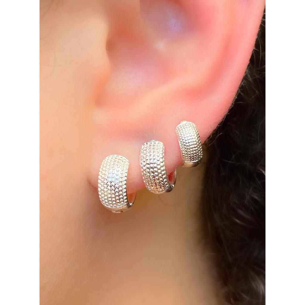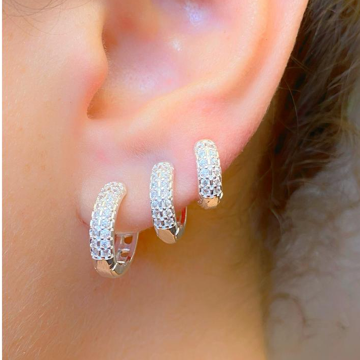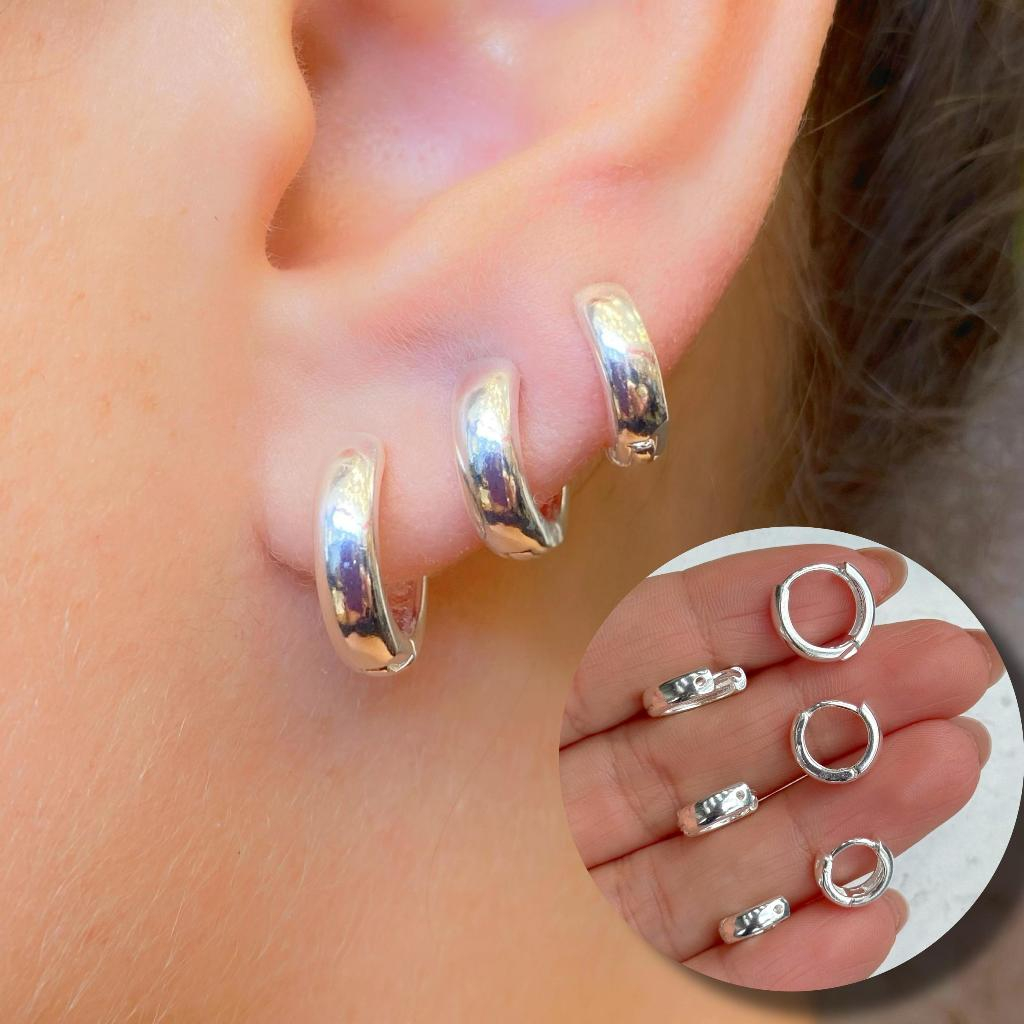 Trio de Argolas Prata 925 Lisa Cravejada Ponto de Luz Kit Feminino 3 Pares Brinco Click