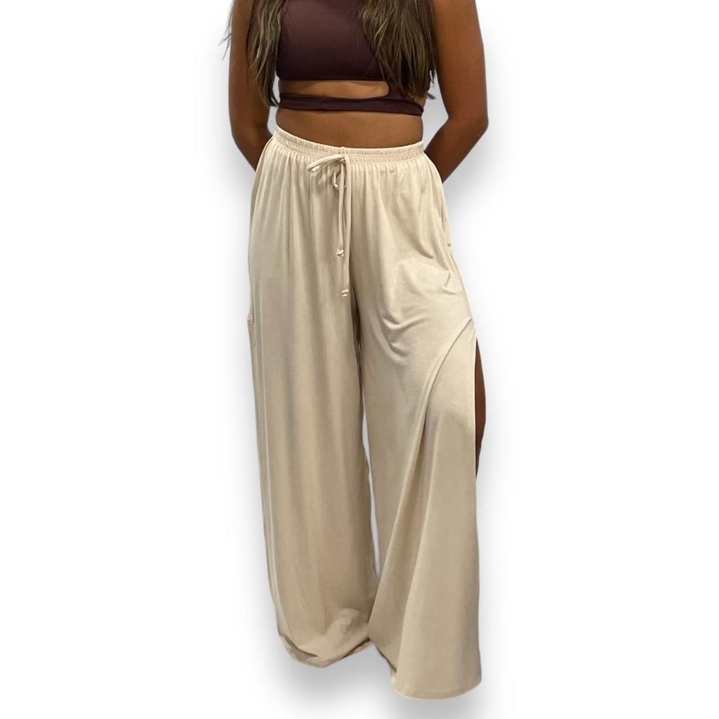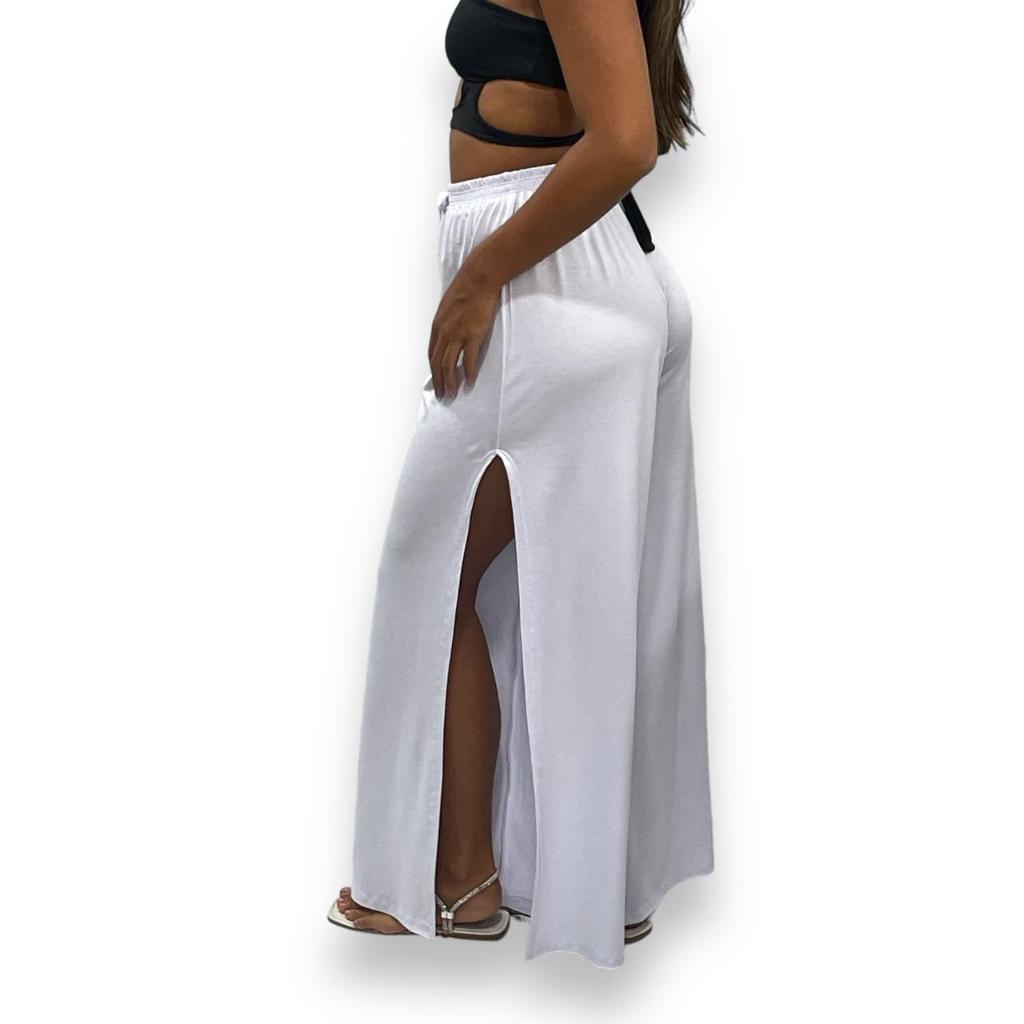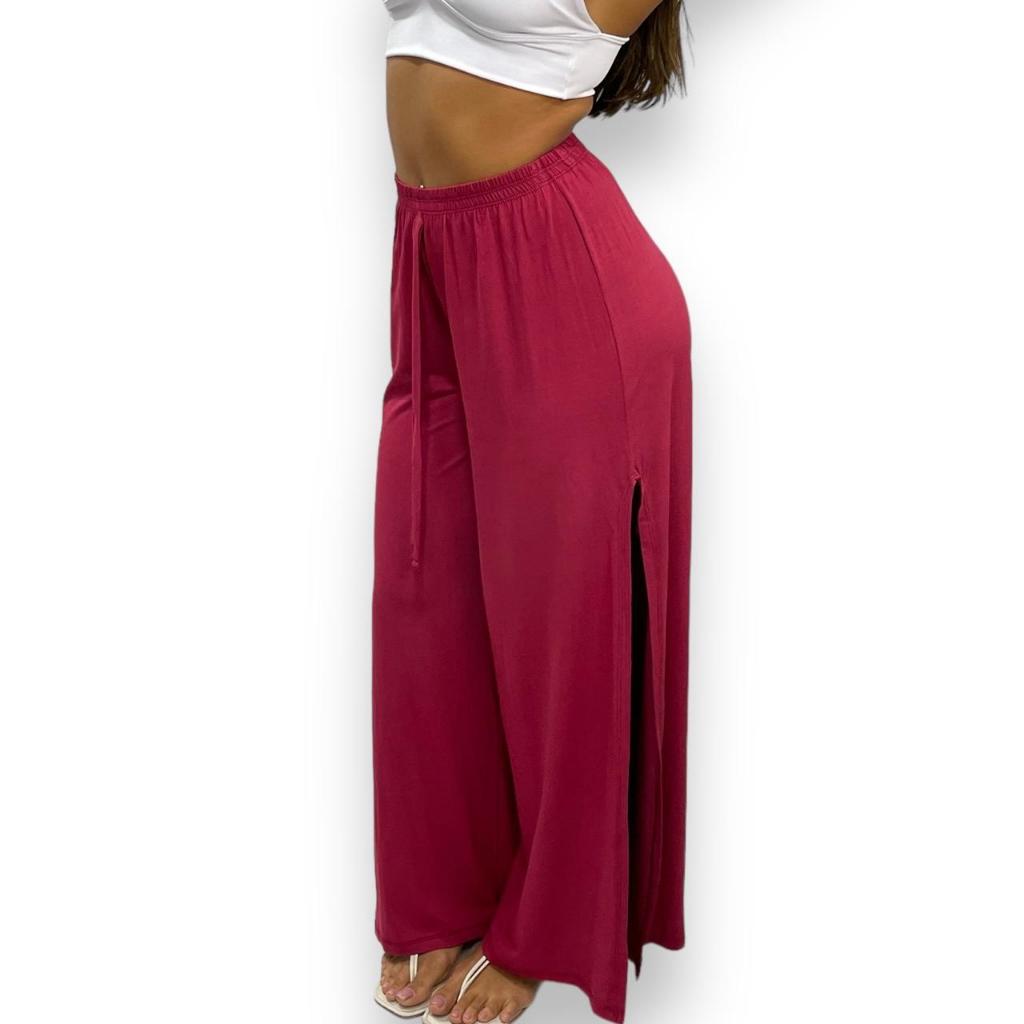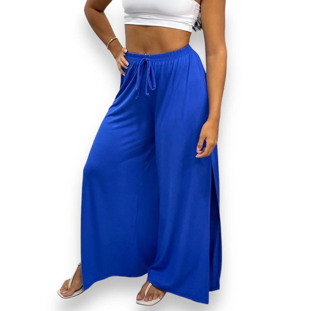 Calça Pantalona Feminina Cintura Alta com Fenda Lateral de Malha Premium Tecido Leve Soltinho