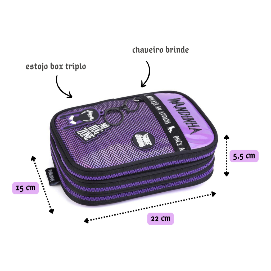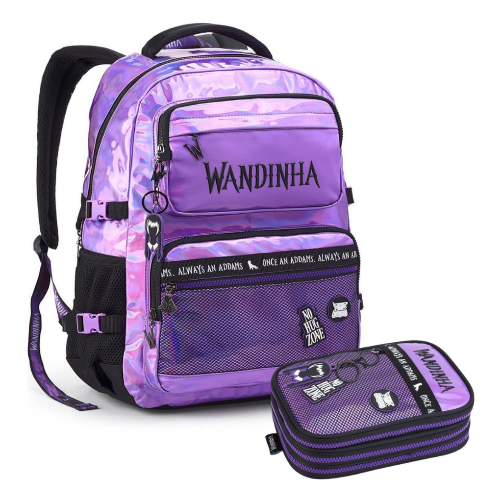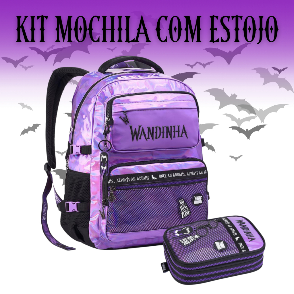 Kit Mochila Vandinha Addams Wandinha Escolar Grande Costas e Estojo Box Triplo Holográfico Feminina