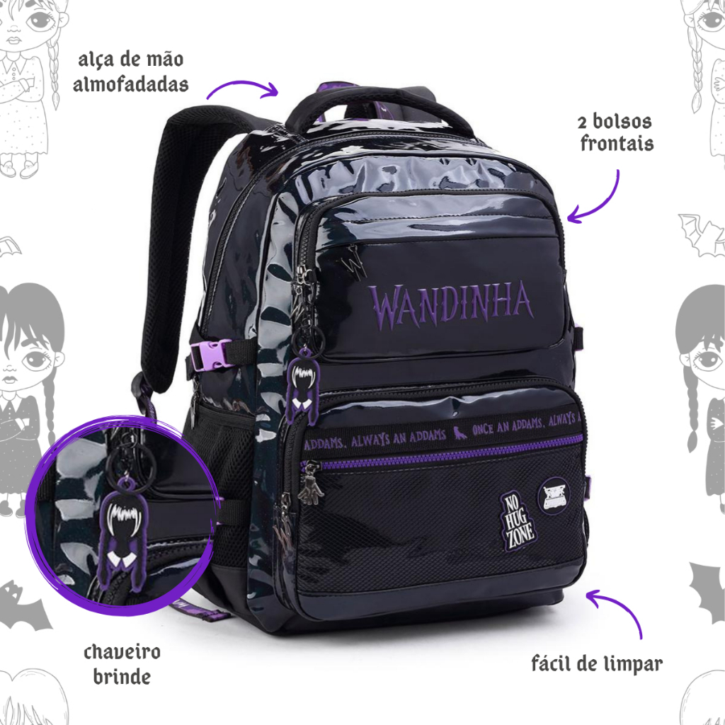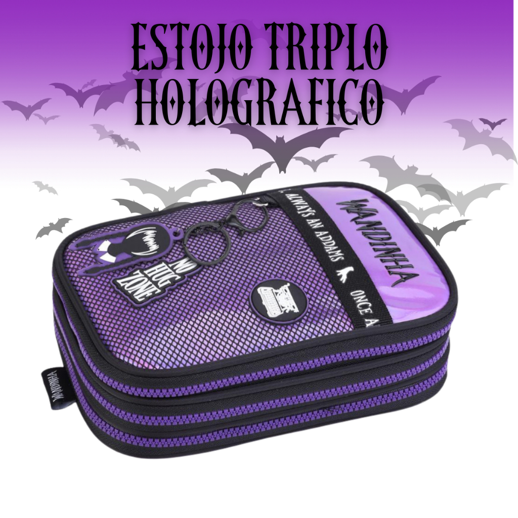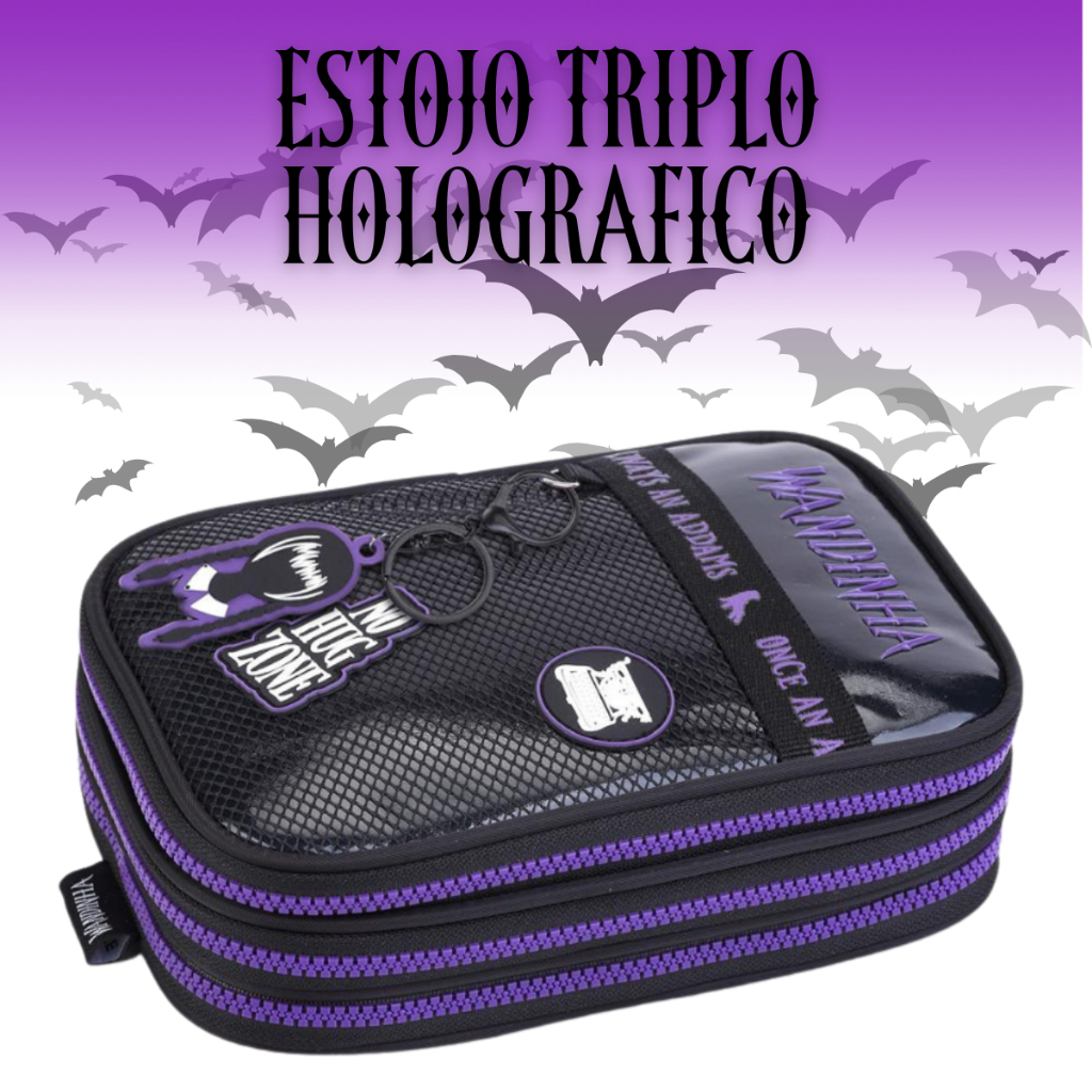 Kit Mochila Vandinha Addams Wandinha Escolar Grande Costas e Estojo Box Triplo Holográfico Feminina