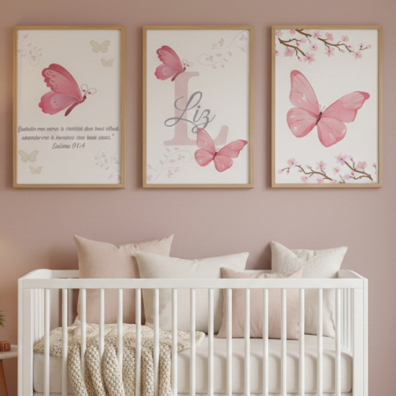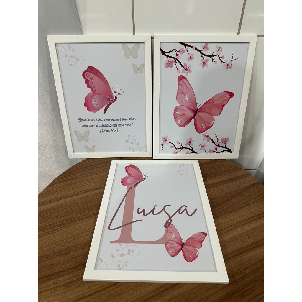 Kit 3 Quadro decorativo menina borboletas para quarto infantil — com ou sem moldura