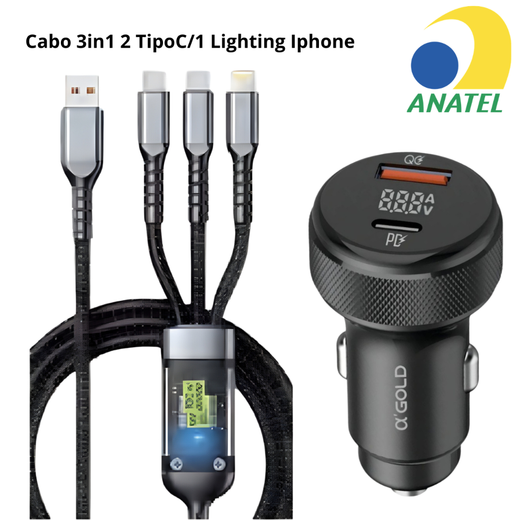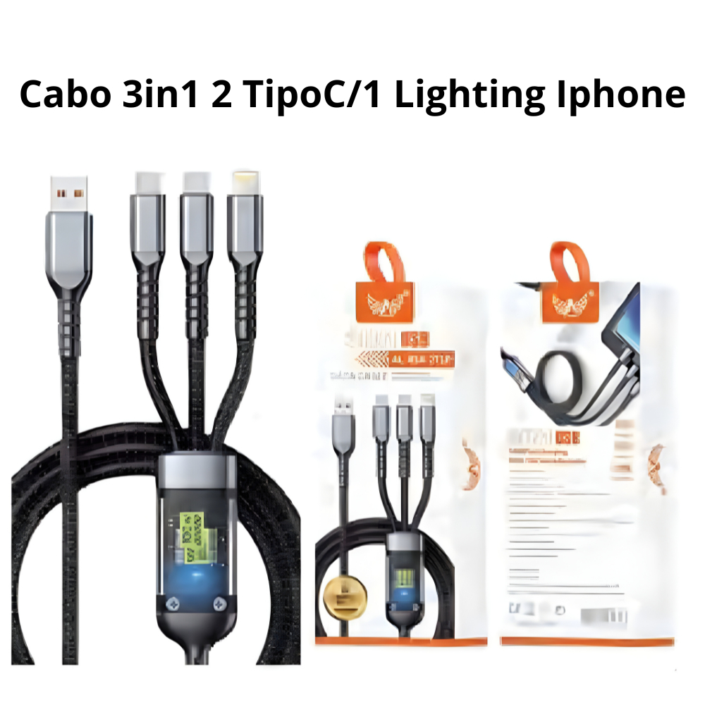 Cabo de Dados Celular 3 em 1 Carregamento Ultra Rápido 100W Resistente IOS V8 Tipo C 1.2 Metros