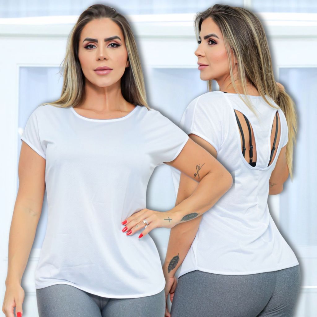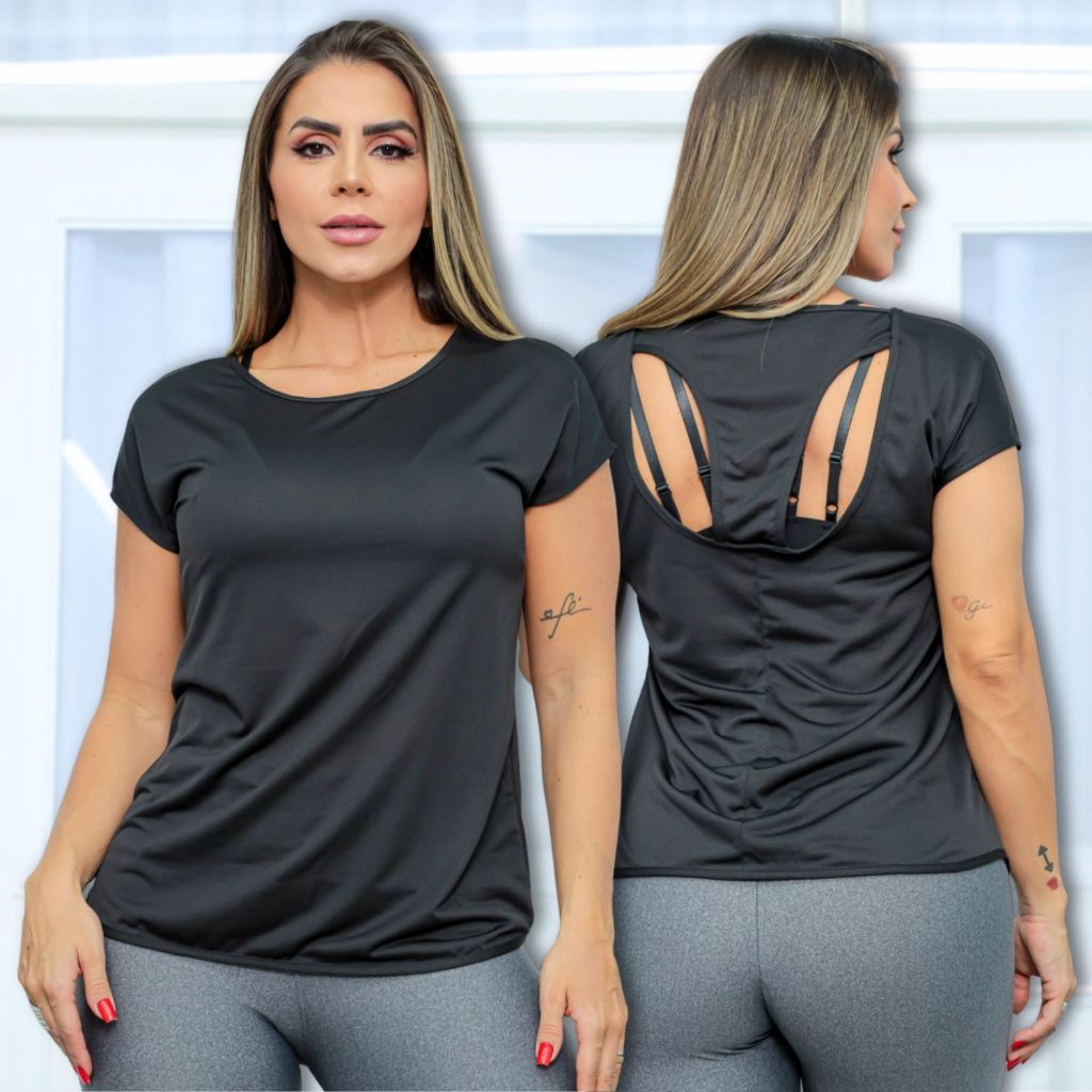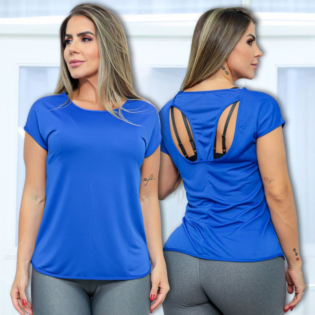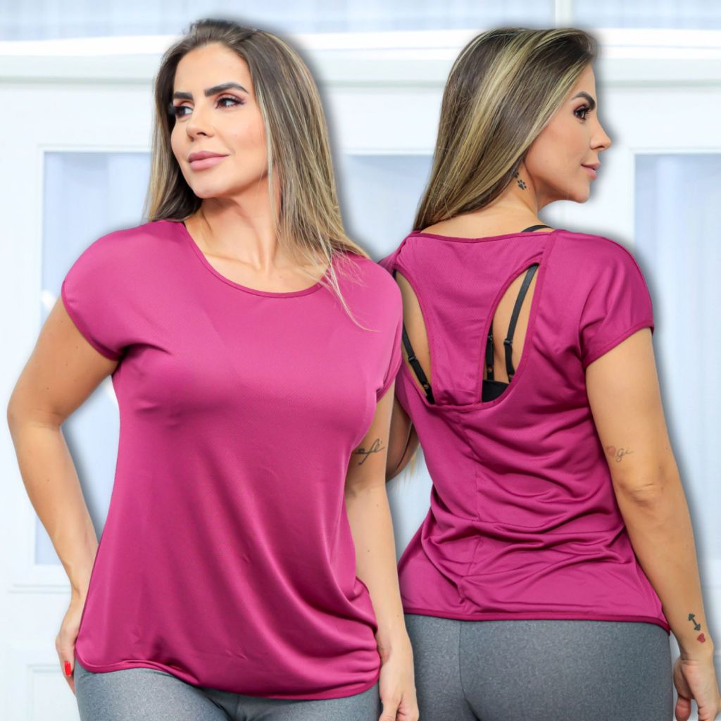 Camisa Fitness Feminina Dry Fit Academia Blusa Manga Curta Treinos Básica Costas Vazada Respirável Premium