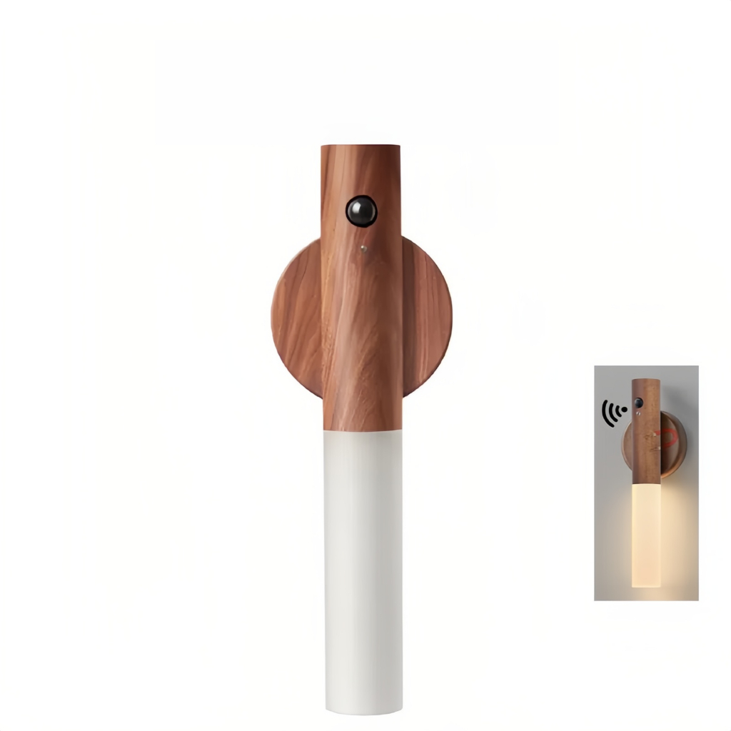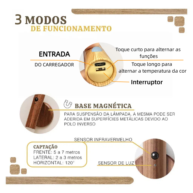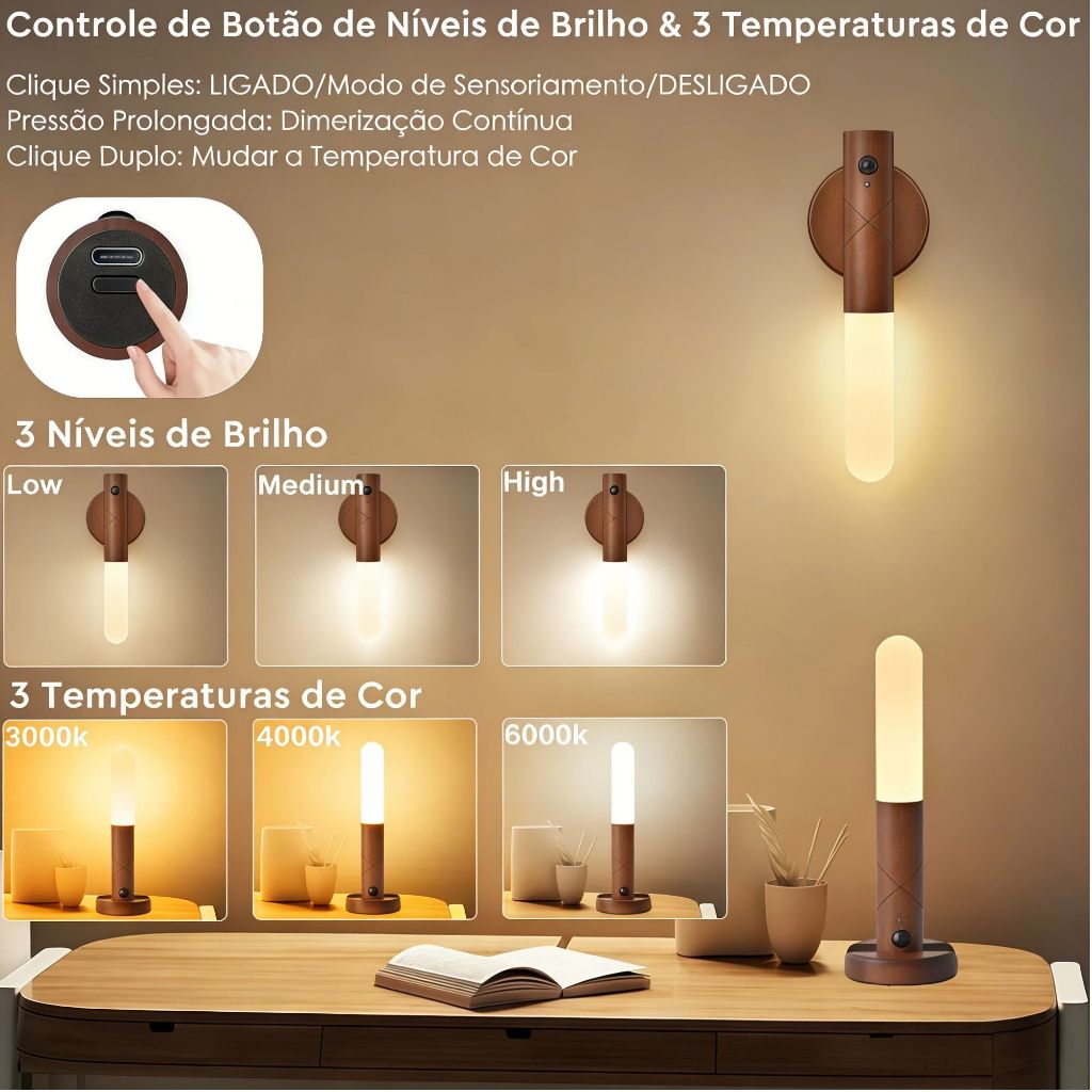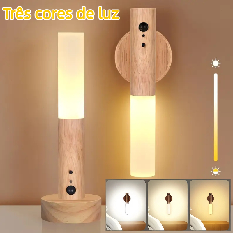Luminaria Led Recarregável Sensor de Movimento Arandela de Madeira Minimalist Mesa Parede Magnética 3 cores ajustáveis