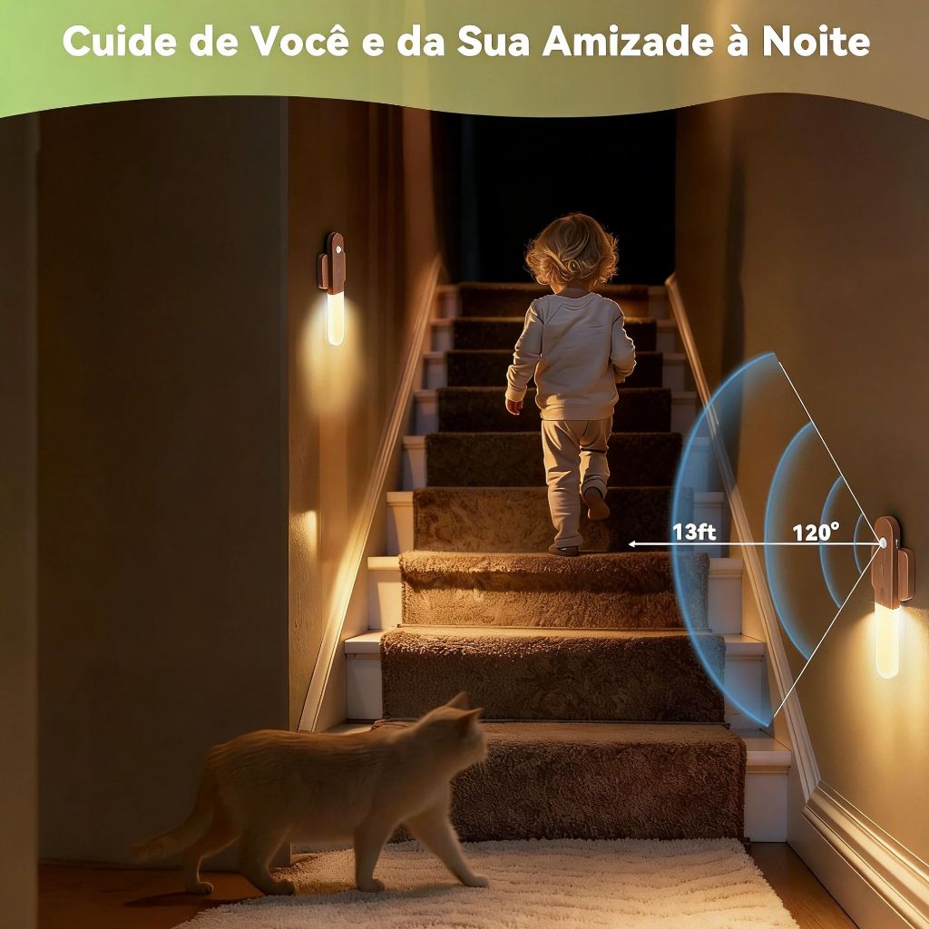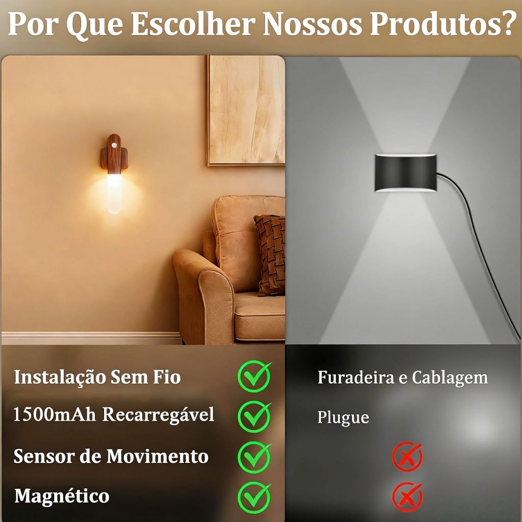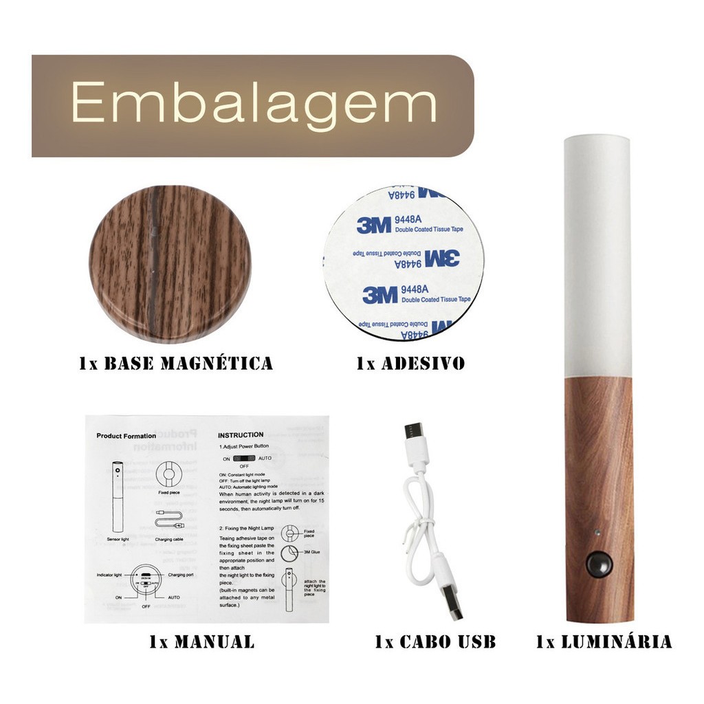 Luminaria Led Recarregável Sensor de Movimento Arandela de Madeira Minimalist Mesa Parede Magnética 3 cores ajustáveis