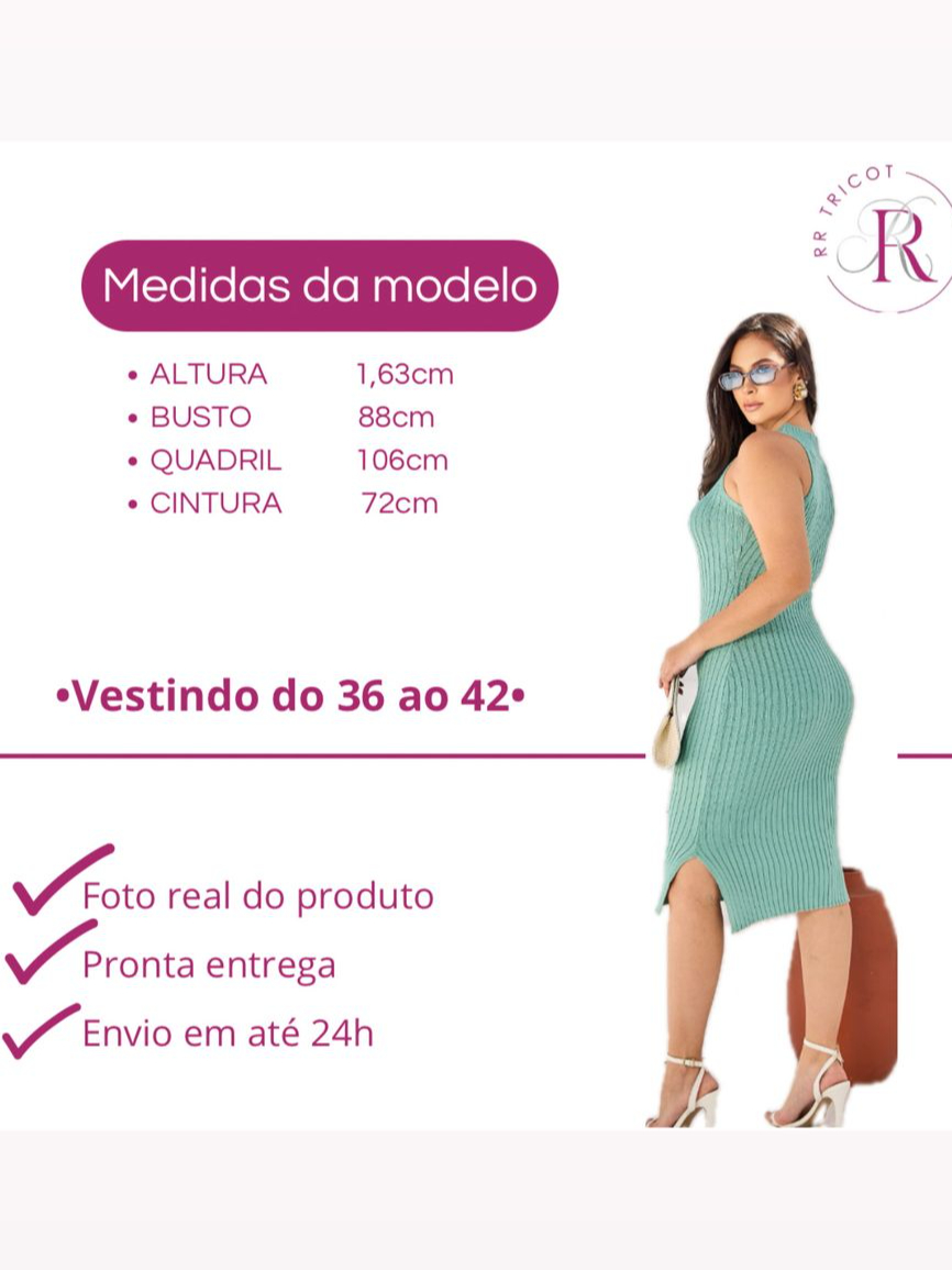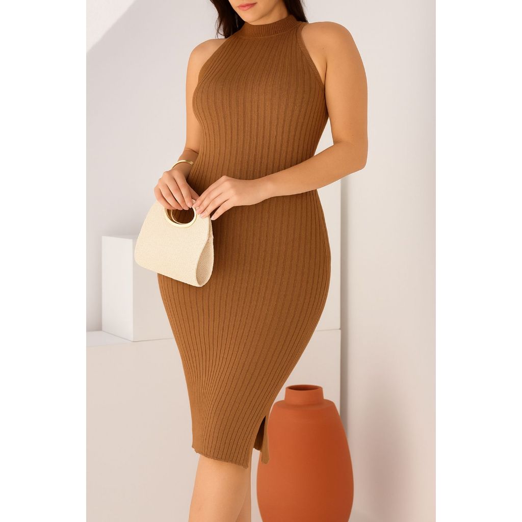 Vestido Midi Tricot Modal Canelado Sem Manga Moda Verão com Fenda Na Lateral