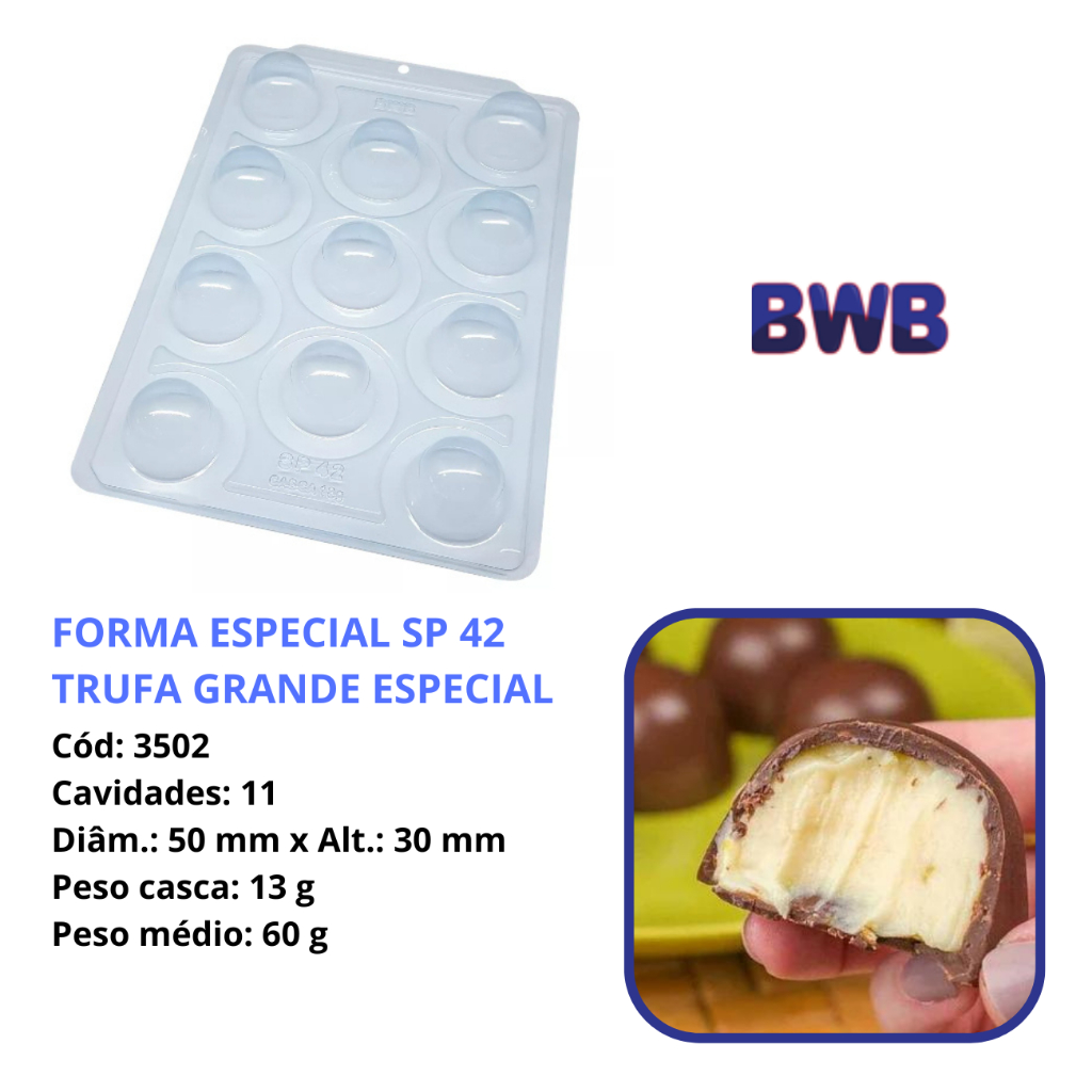 Forma SP42 Trufa Bombom 60g BWB 🍫 3 Partes c/ Silicone • 11 Cavidades • Linha Premium