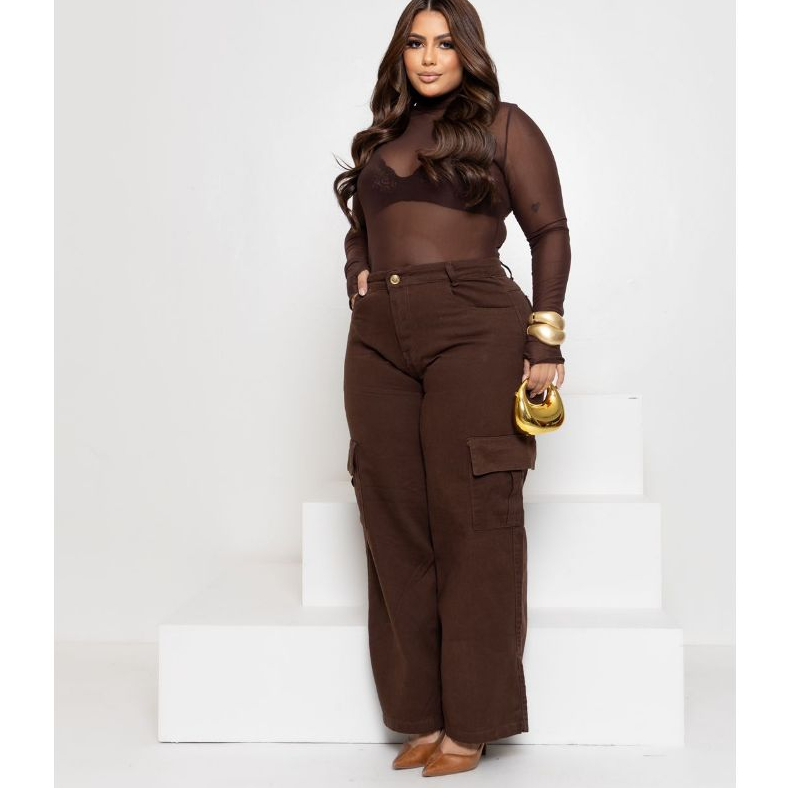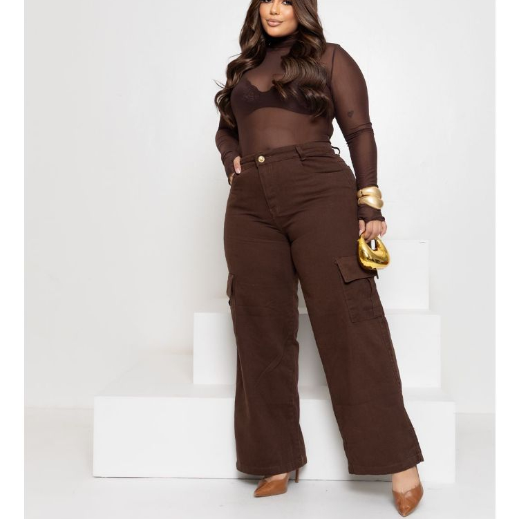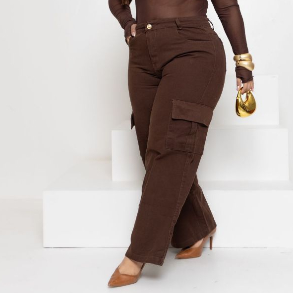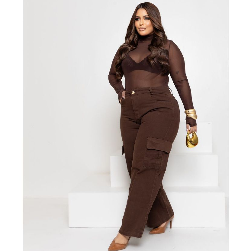 Calça Jeans Feminina Wide Leg Cargo Plus Size Marrom