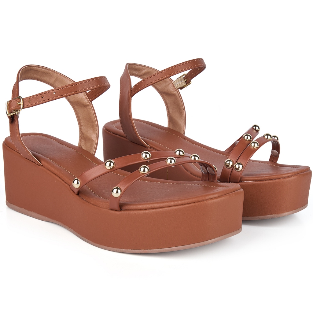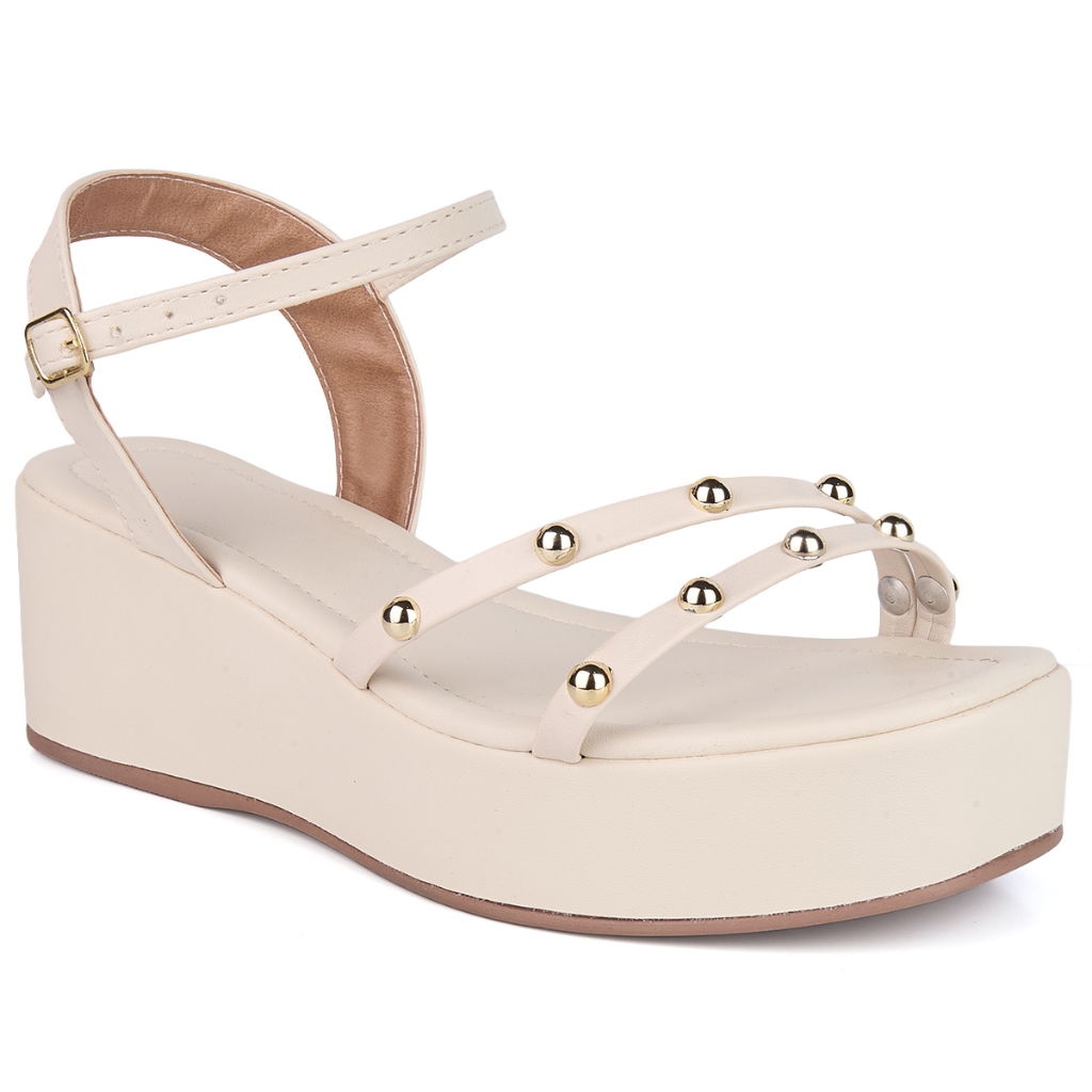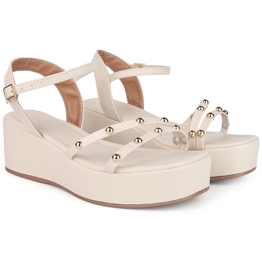 Sandália Anabela Feminina Plataforma E Tiras com Detalhes de ABS Dourado Ajuste de Fivelas Confortável