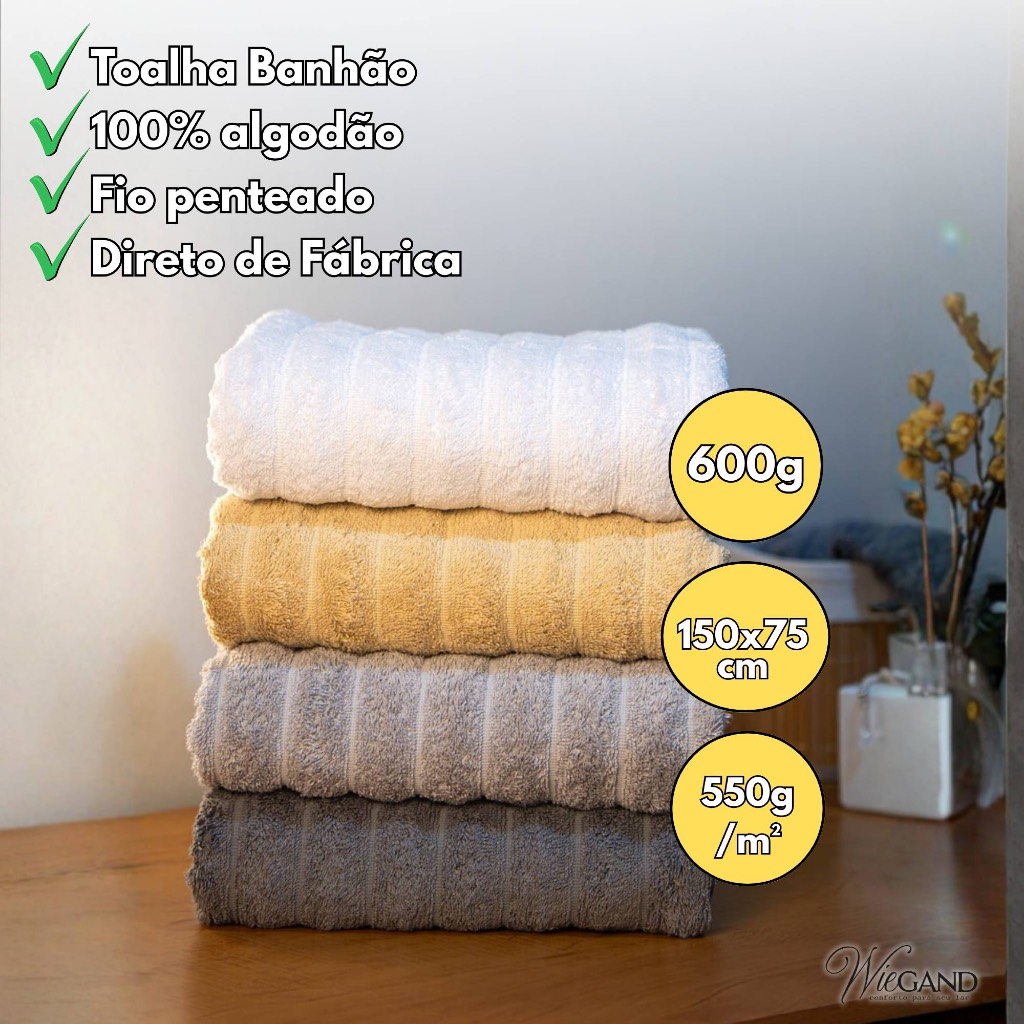 Kit 4 Toalhas Banhão 75x150cm – 600g – 100% Algodão Premium Fio Penteado Requinte Wiegand