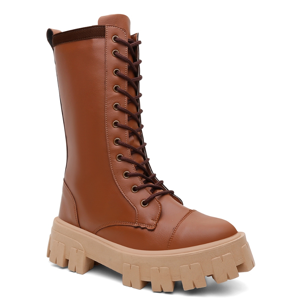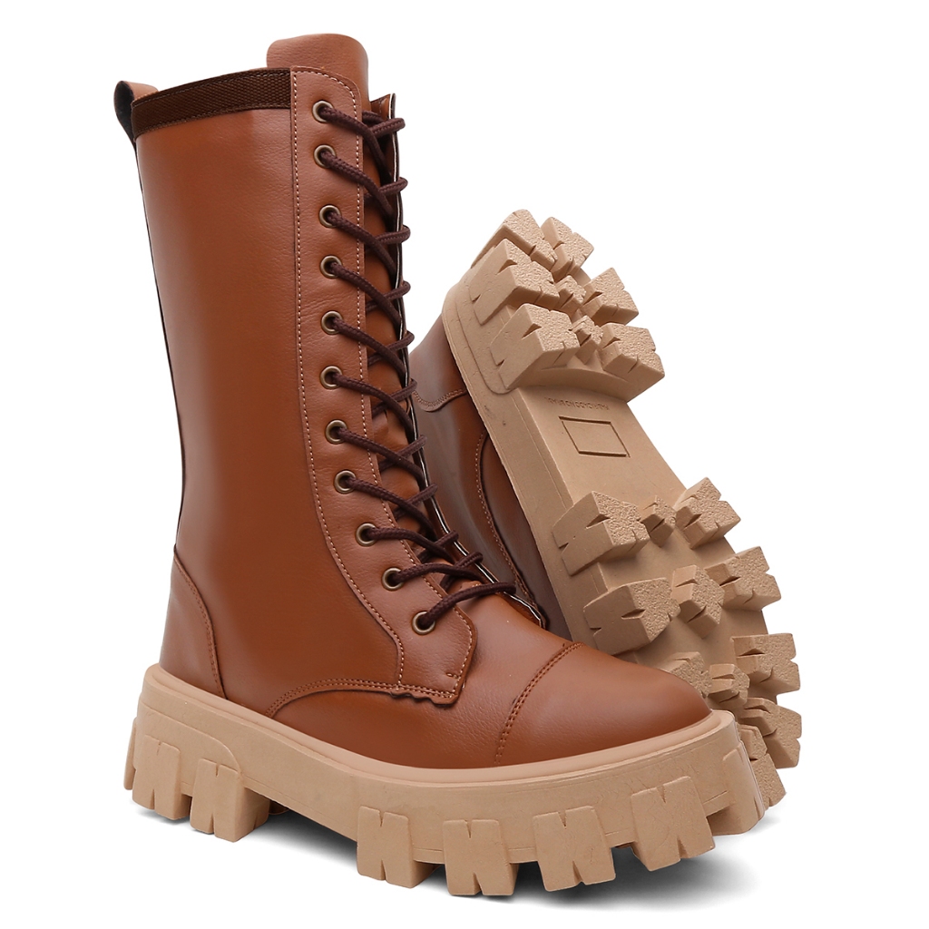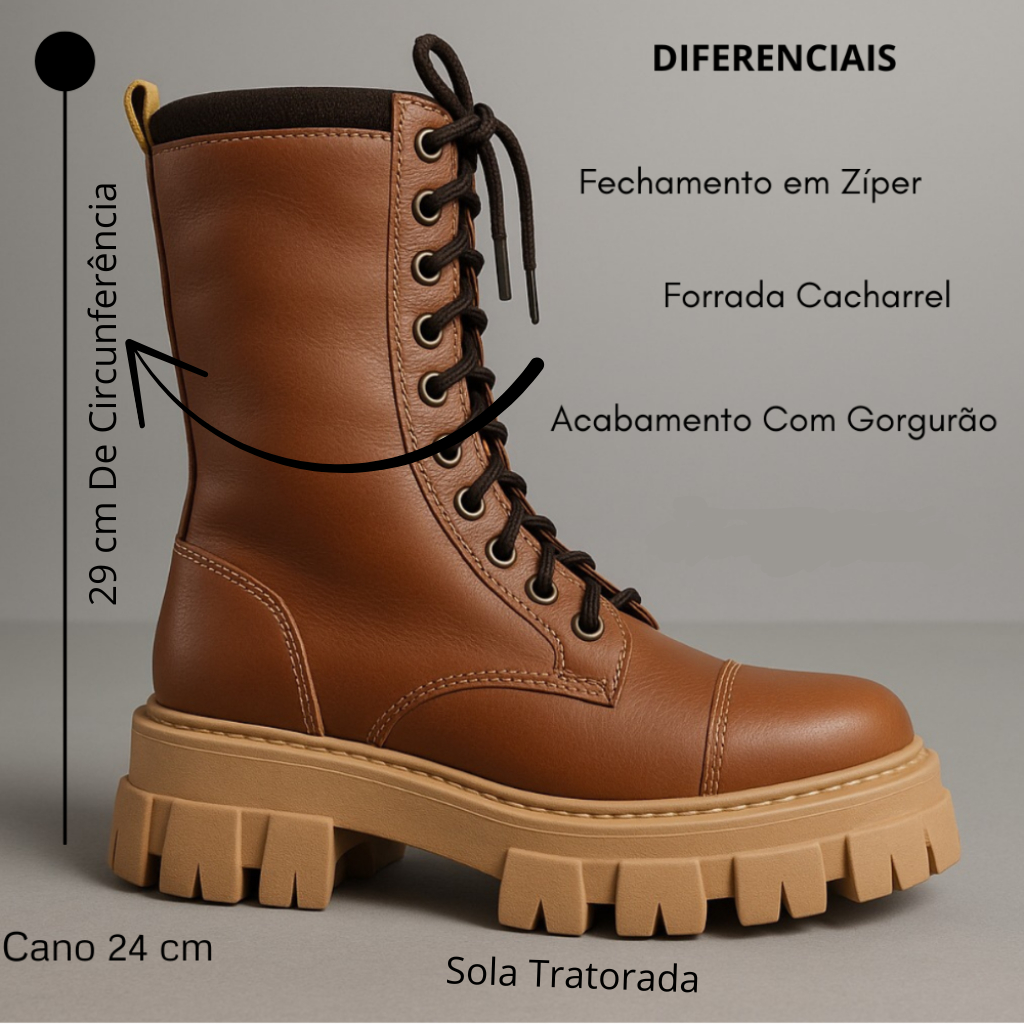 Bota Cano Alto Tratorada Com Ihos Fechamento Com Ziper Acabamento Com Gorgurão Estilo Blogueirinha