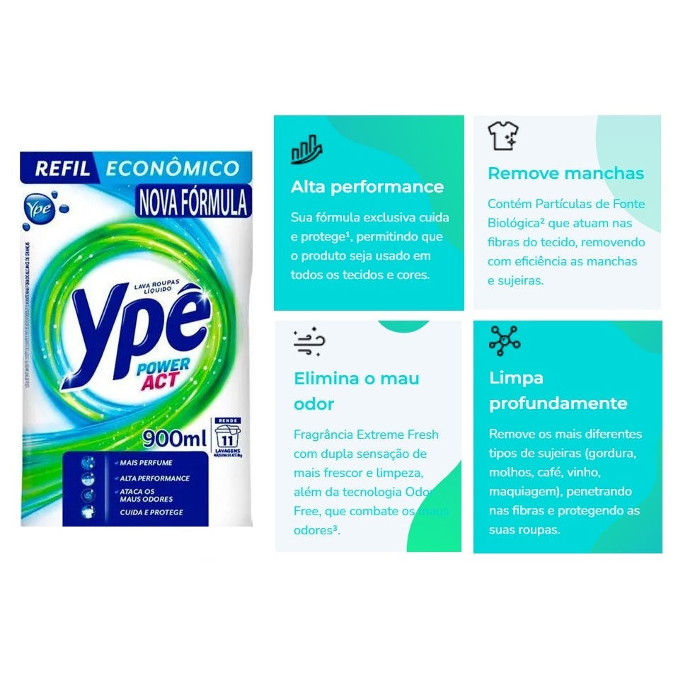 KIT 3 Lava Roupas Líquido Ypê Power Act 900ml Refil