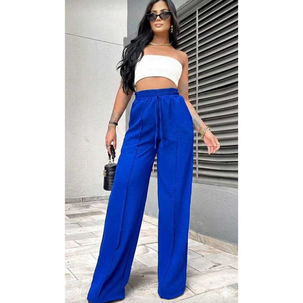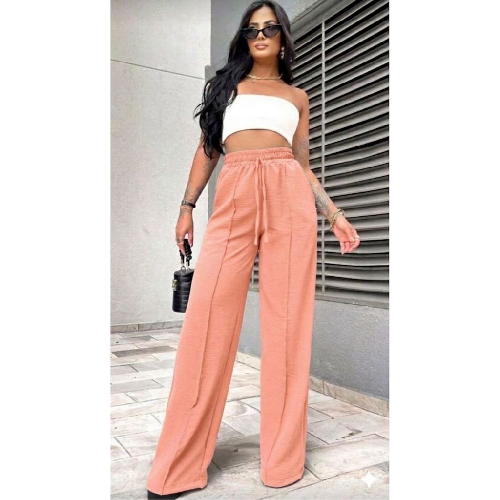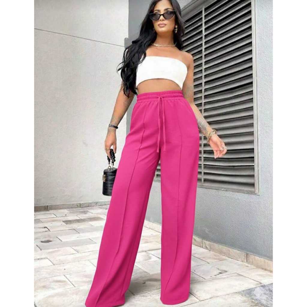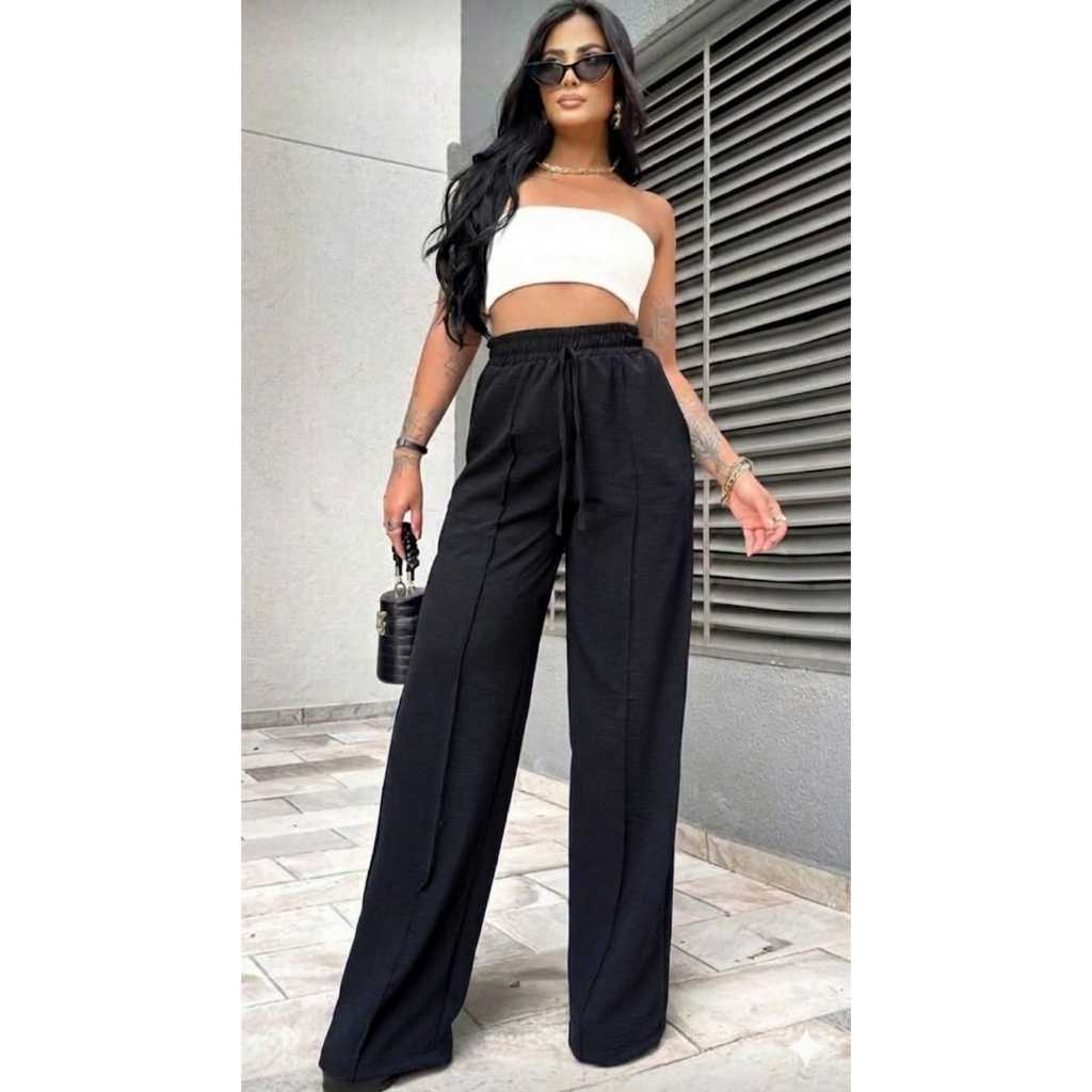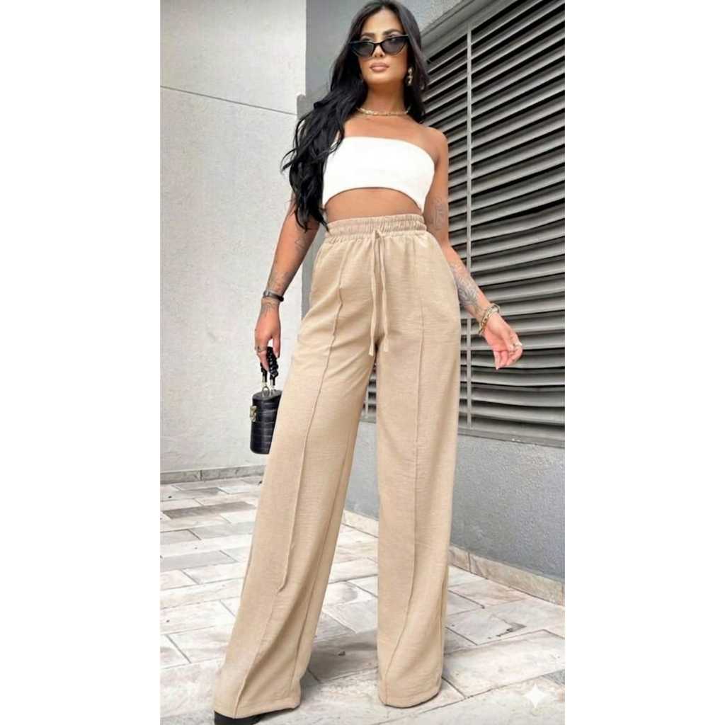 Calça Feminina Pantalona Wide Leg Duna Com Elástico na Cintura Ponteira de Madeira P-M-G-GG