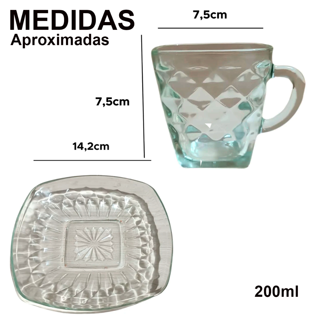 Kit jogo conjunto xicara 200ml 12 Peças sendo 6 Xícaras e 6 Pires Café Chá Cappuccino Vidro Elegante Durável