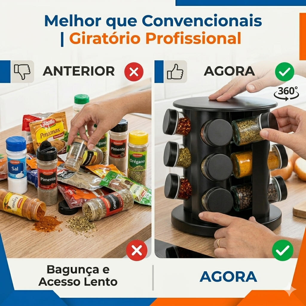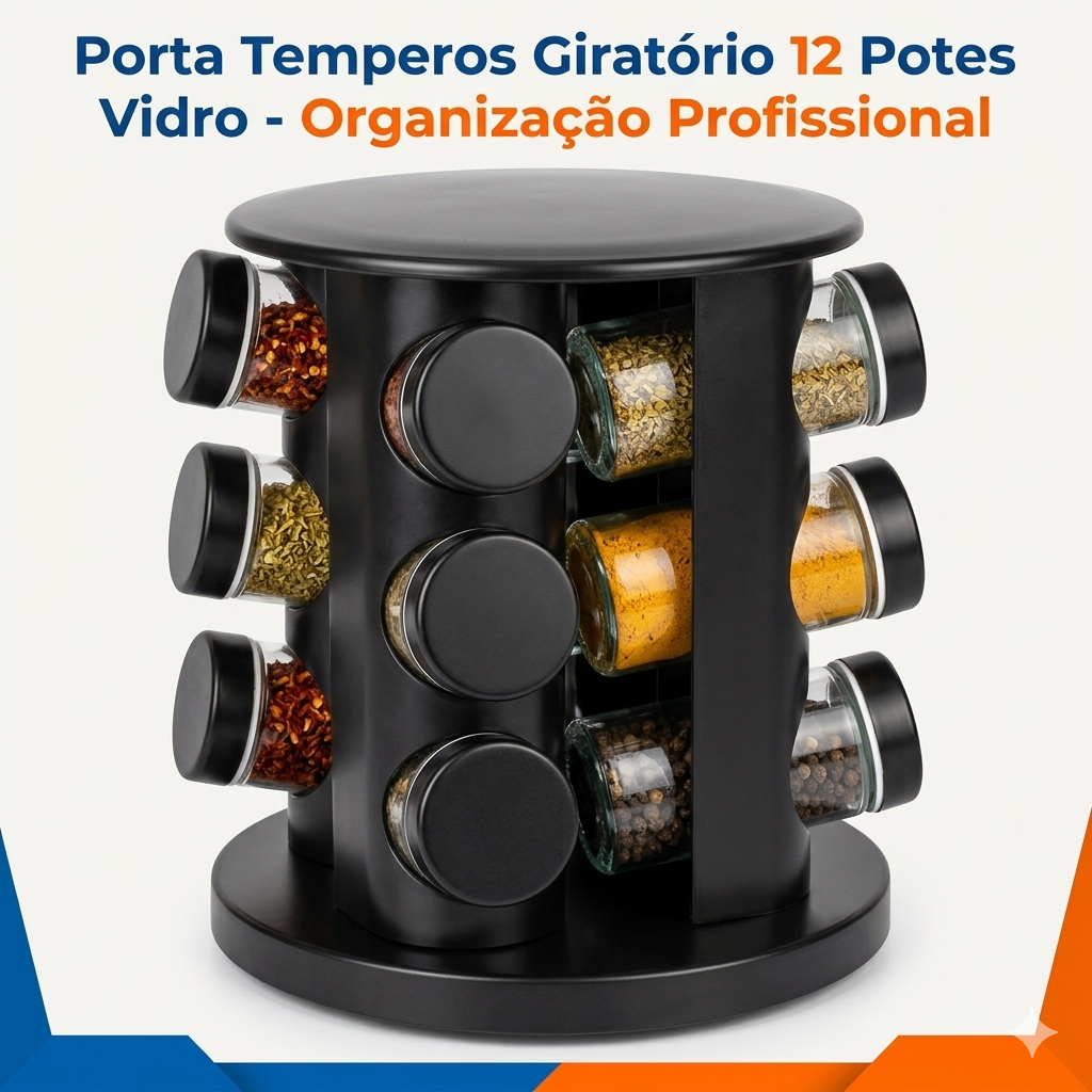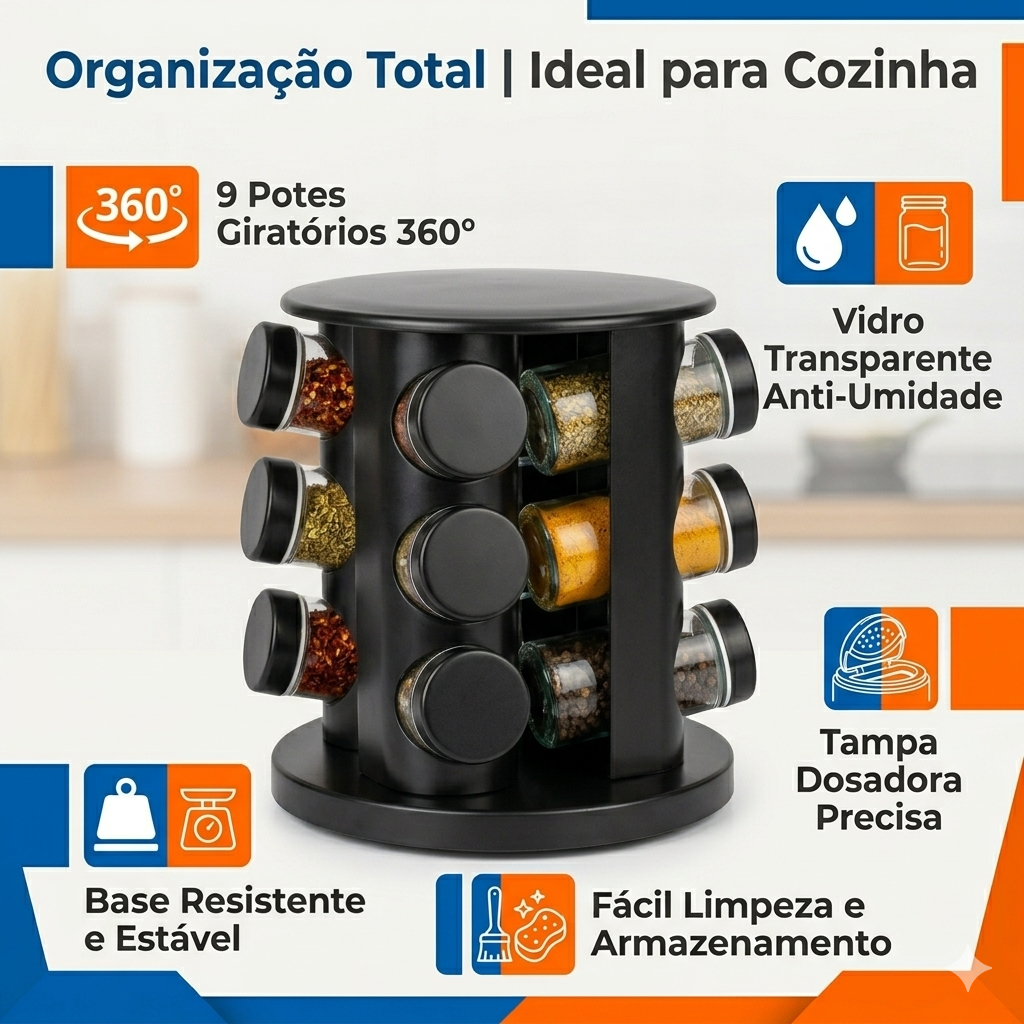 Porta Temperos Giratório Profissional 9 Potes de Vidro com Tampa Dosadora Condimentos