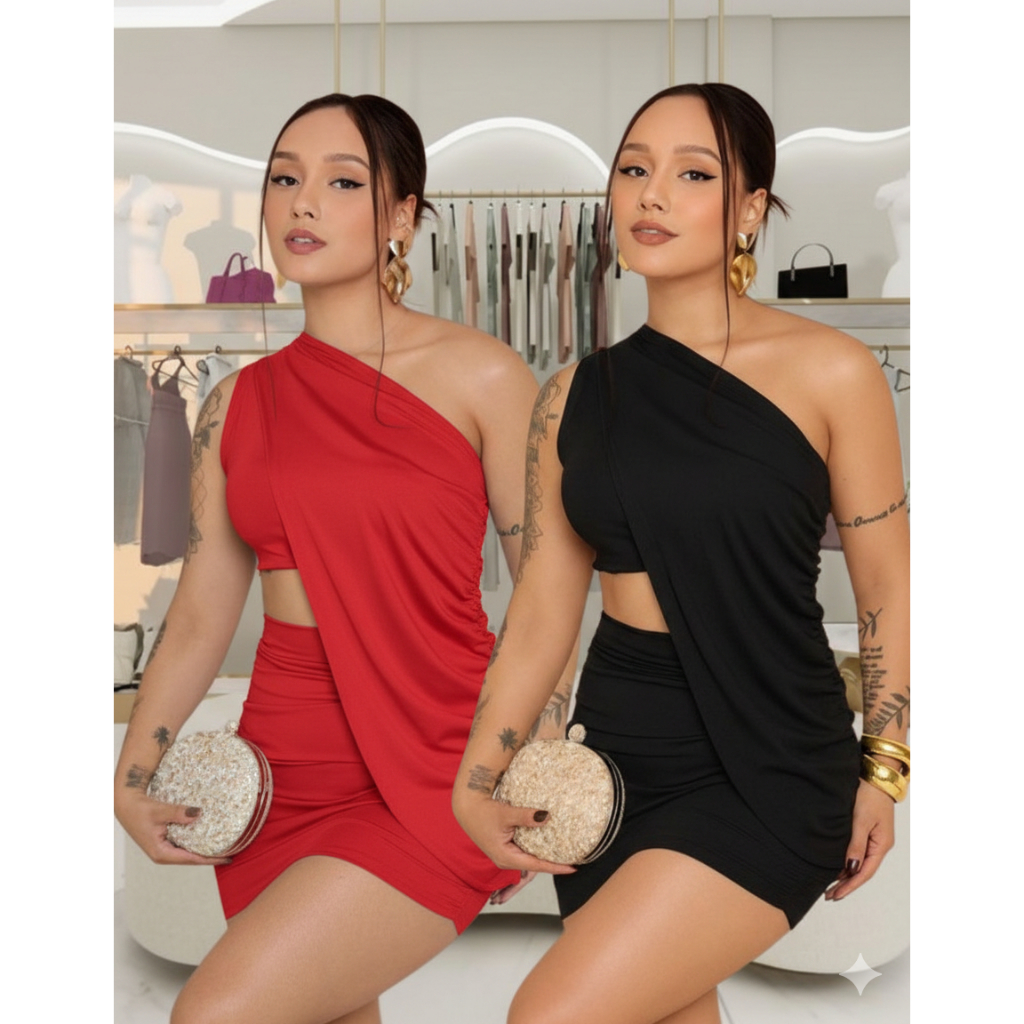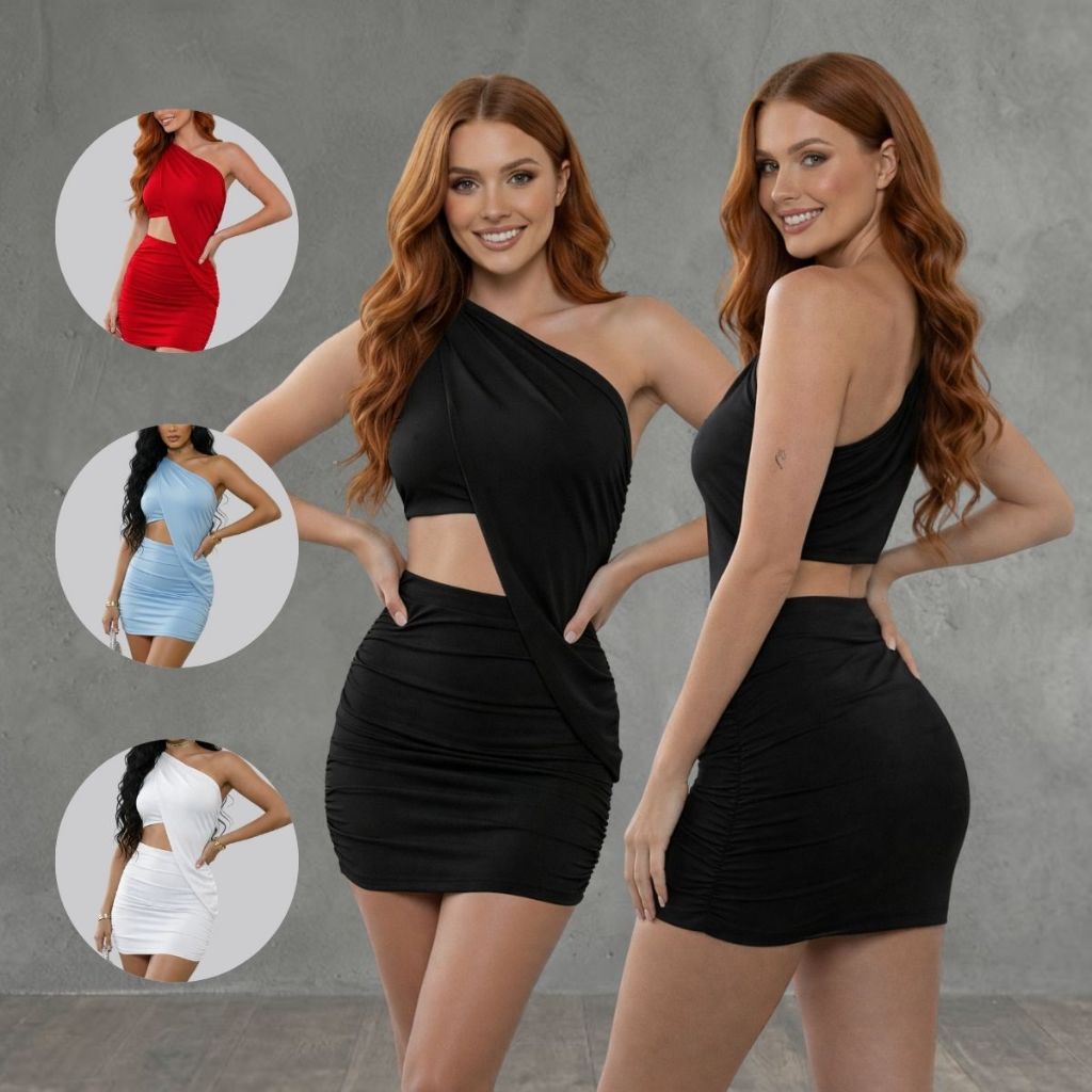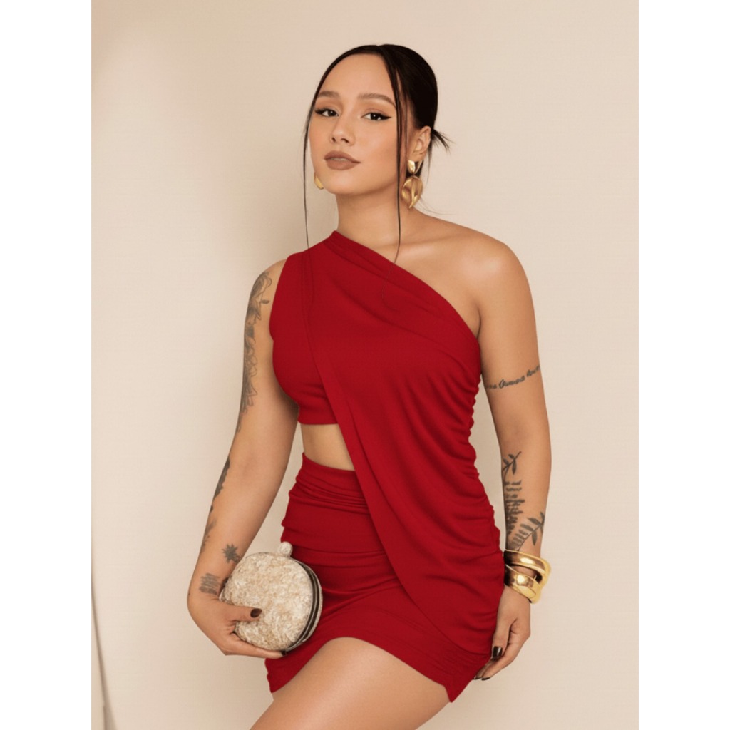 Vestido Feminino Conjunto com 3 Peças Modelador Tecido Suplex Ombro Mula Manca Balada Elegante