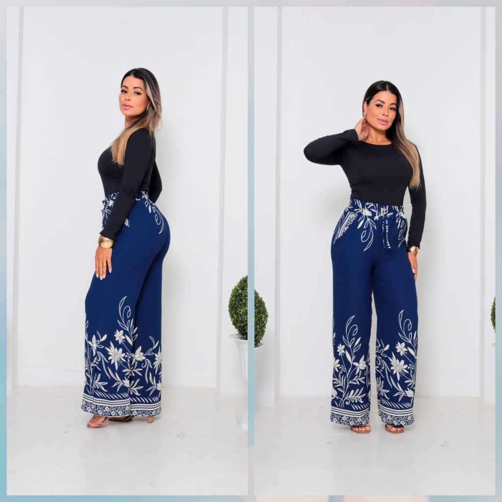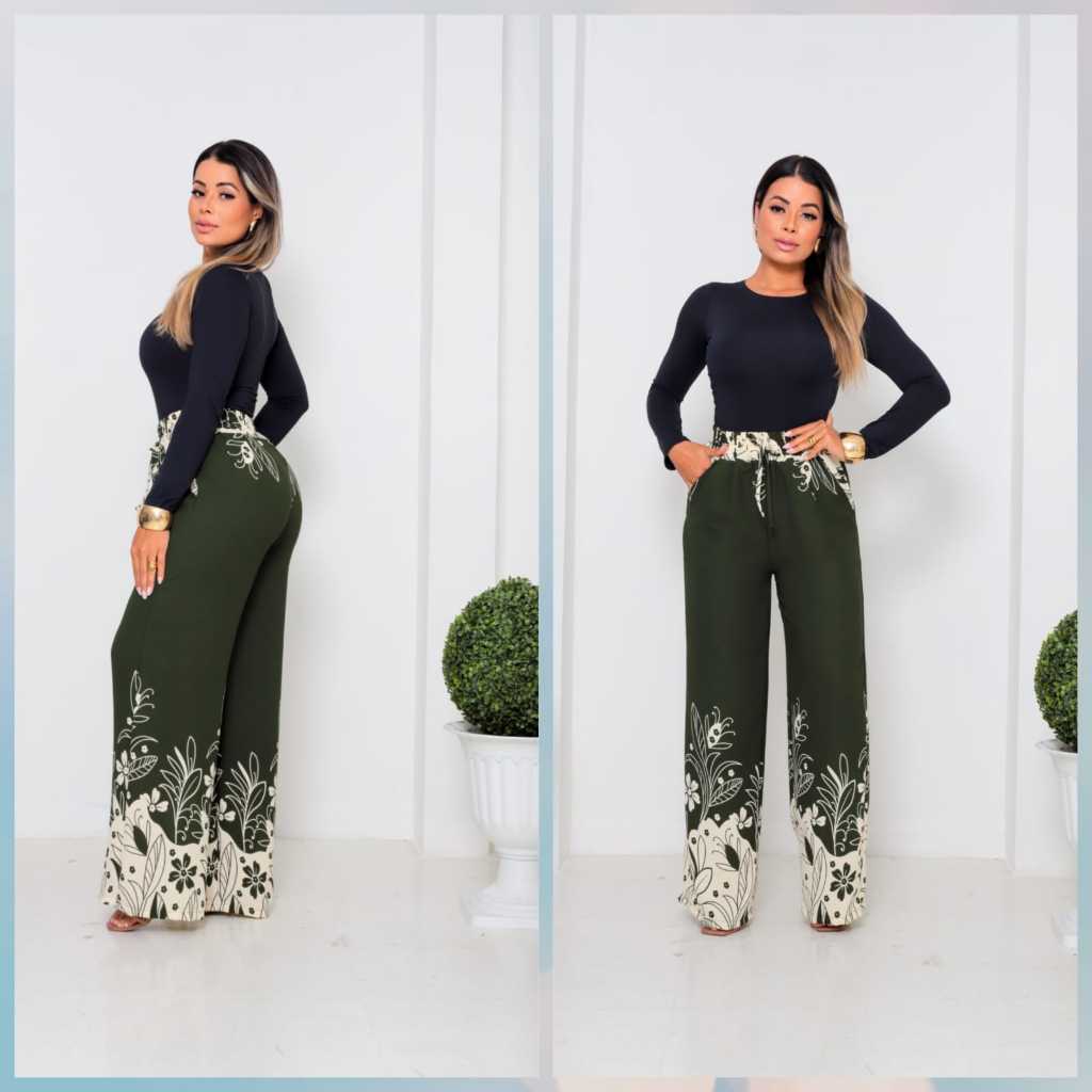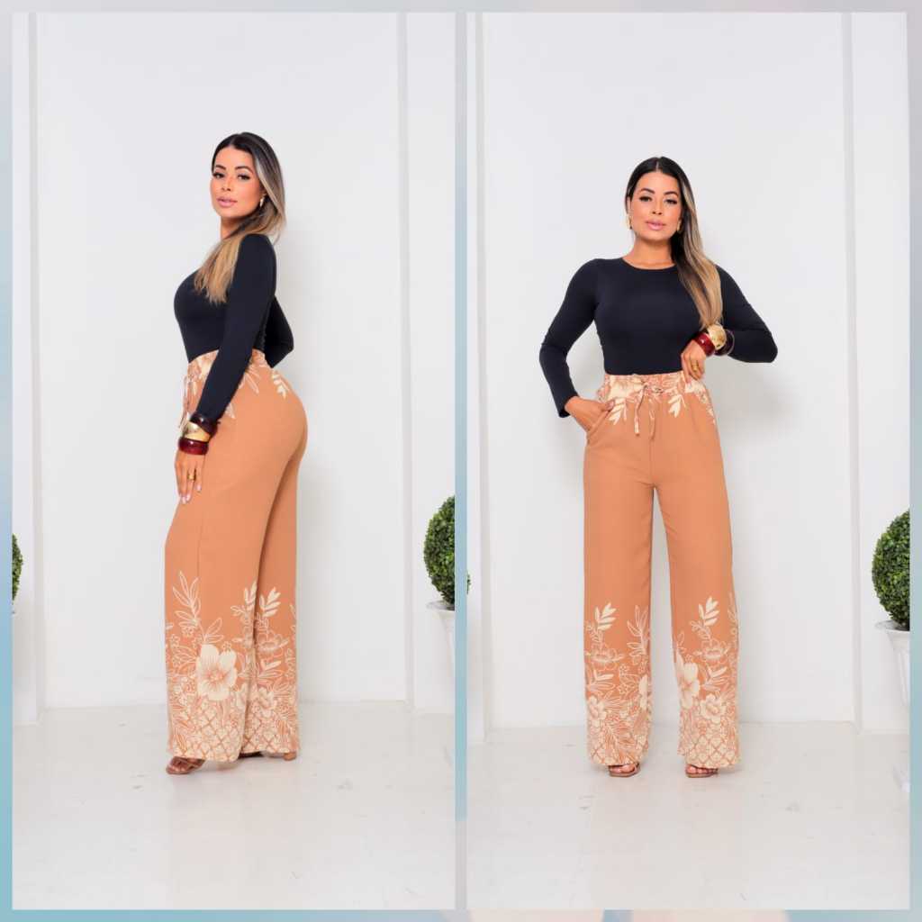 Calça pantalona femenina cintura alta com bolso tecido DUNA estampado
