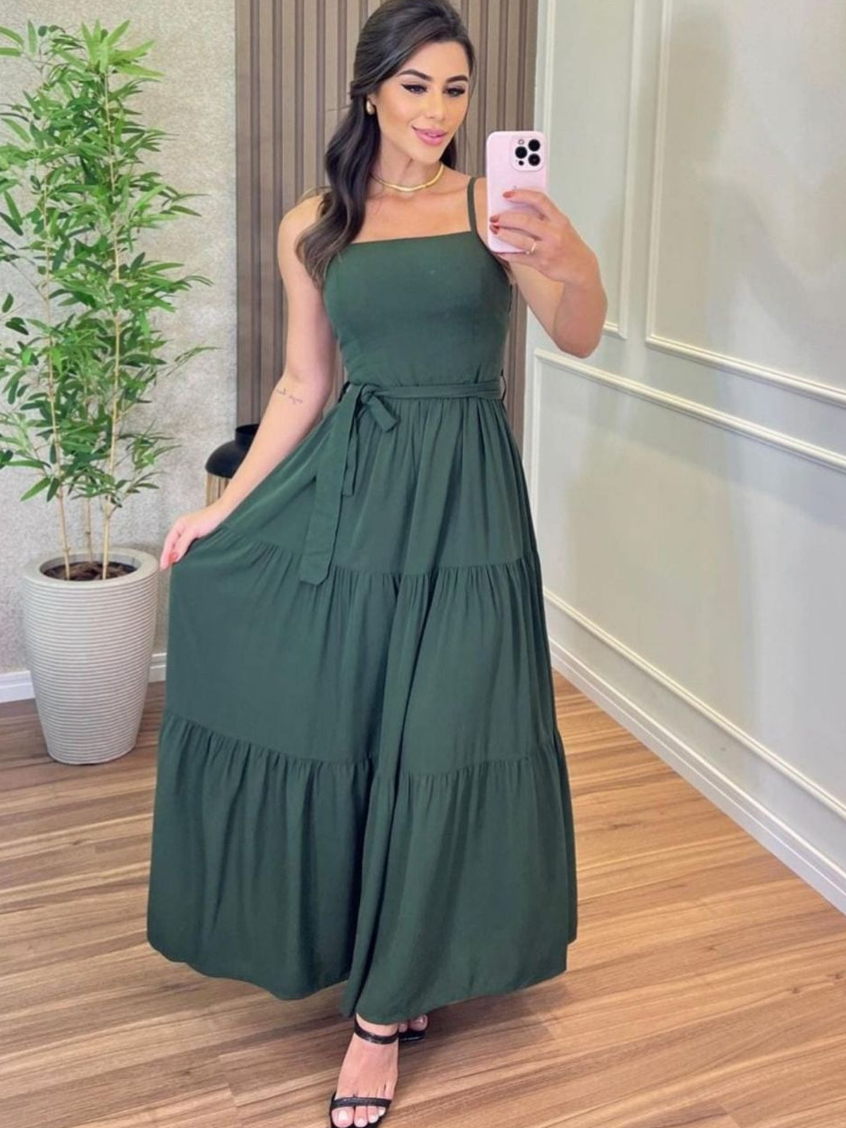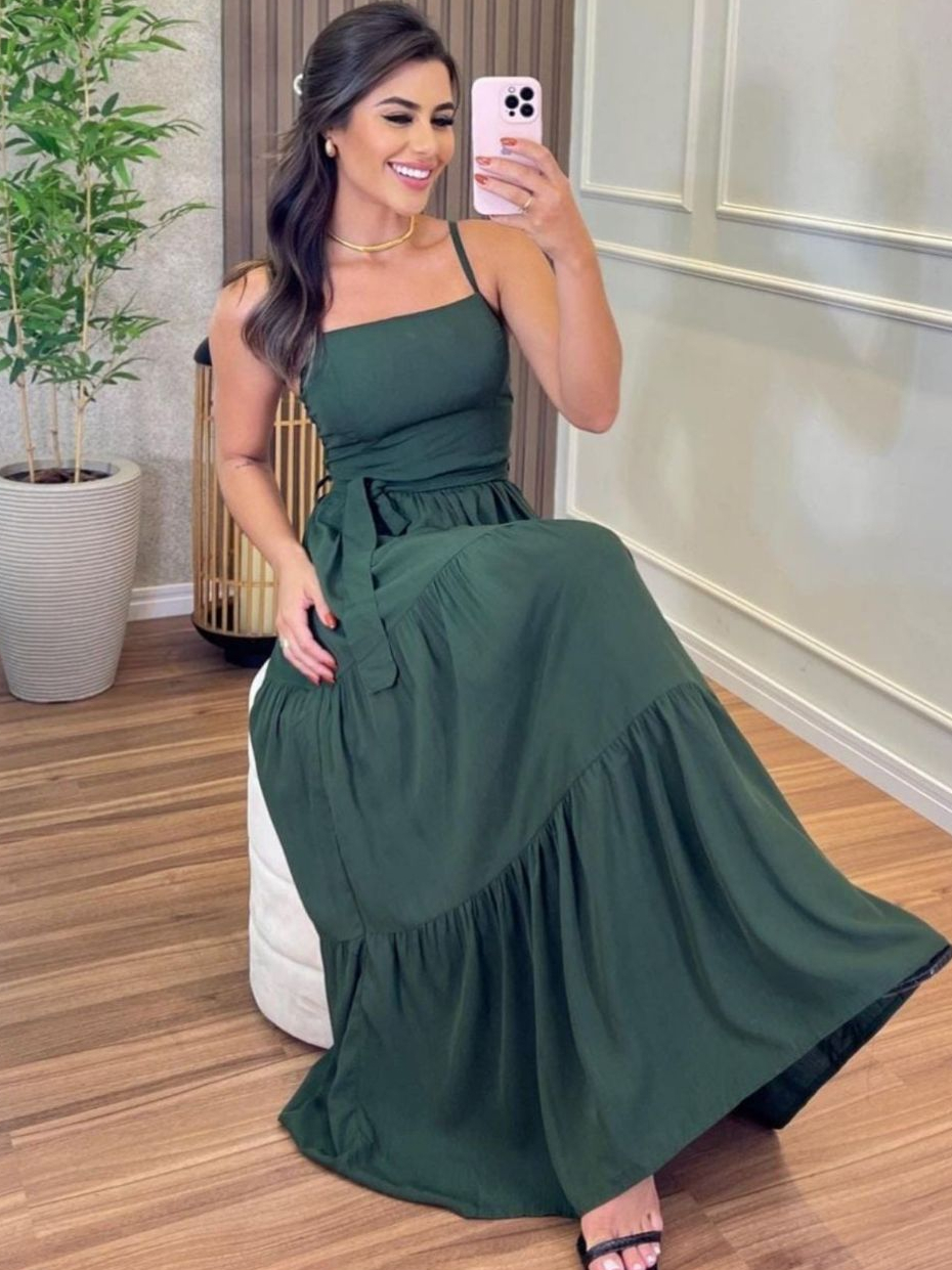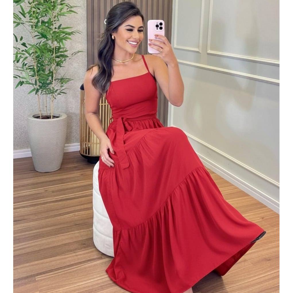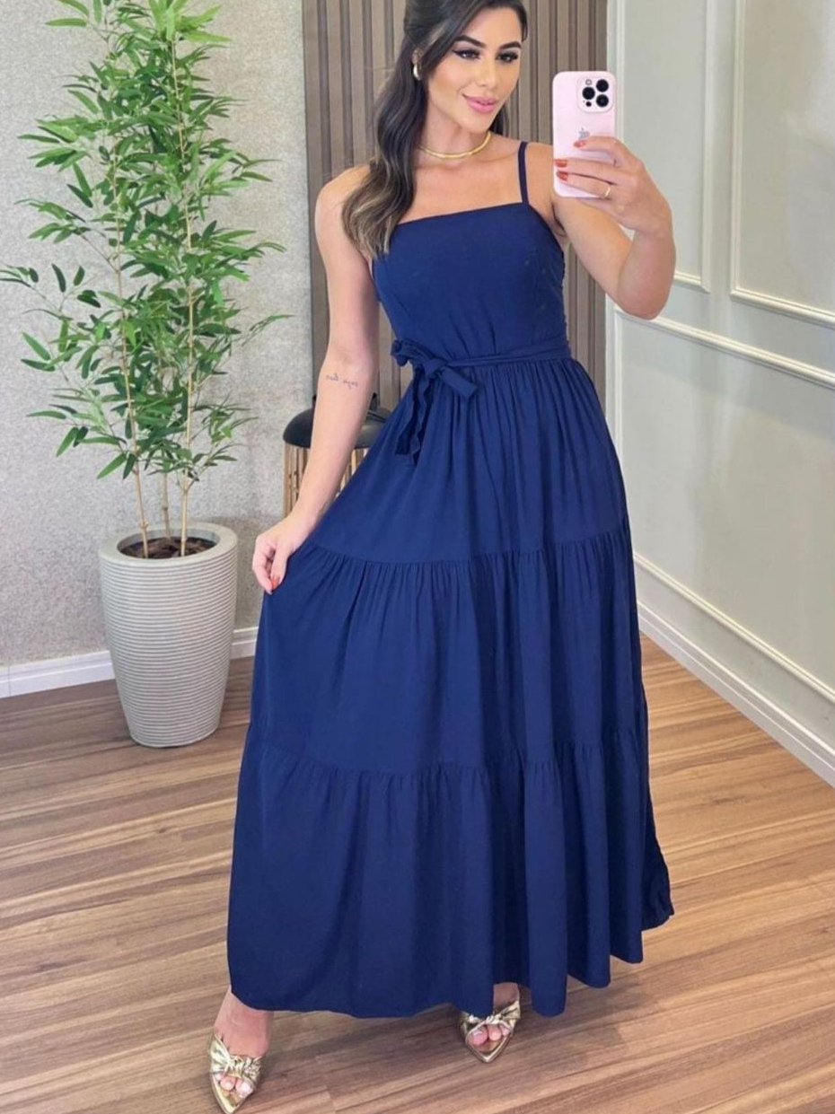 Vestido Longo Feminino Daniela Liso com Cinto Elegante Tamanho Único