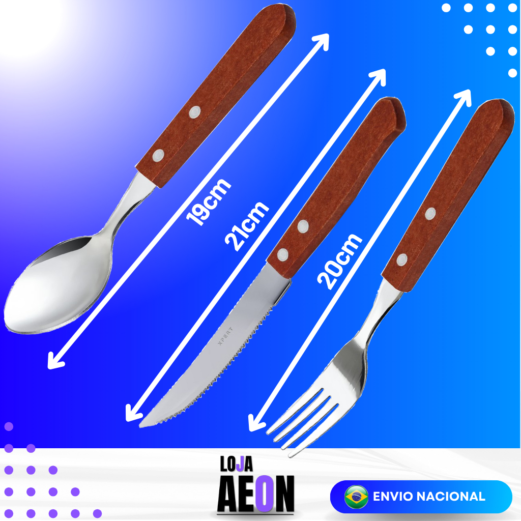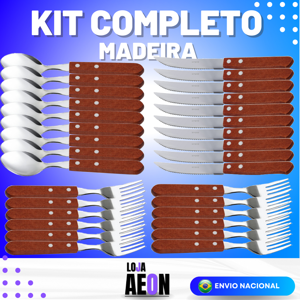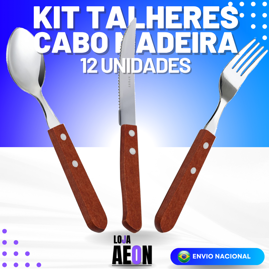 Kit 12 Colheres 12 Garfos 12 Facas Talher Inox Cabo de Madeira Casa Cozinha Restaurante Buffet