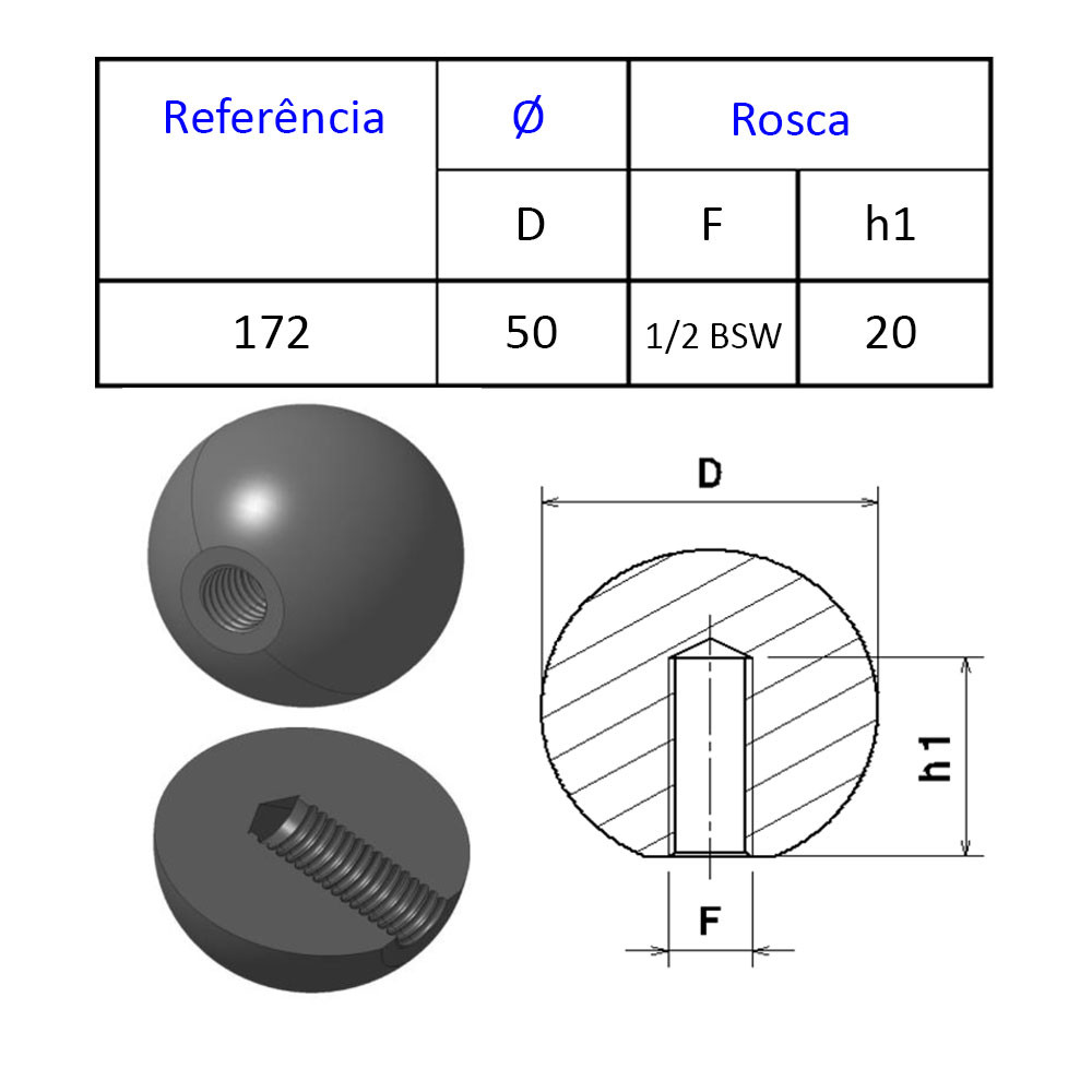 Bola Esfera de Baquelite 50mm - Rosca 1/2'' W com 10 Peças