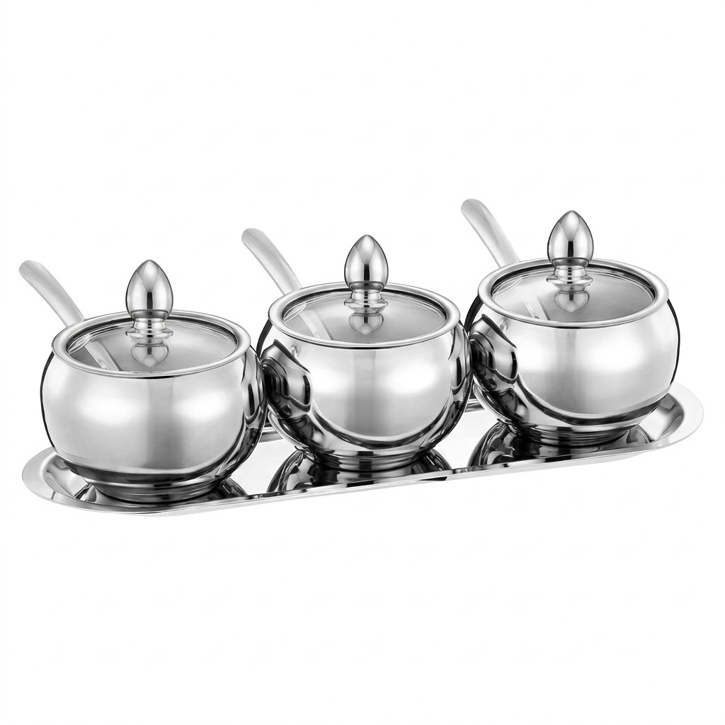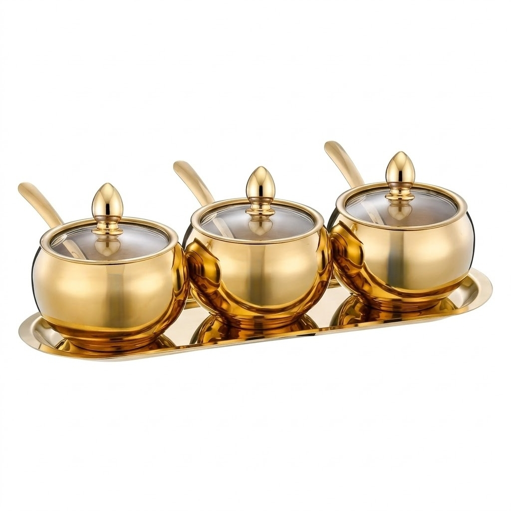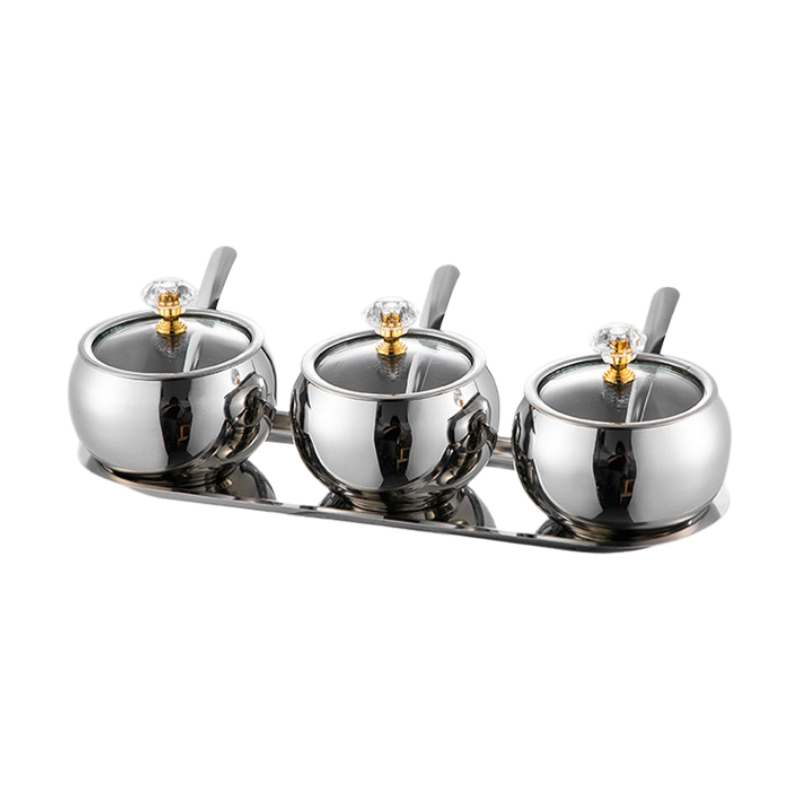 Kit3 Potes Açúcar Condimentos Com Bandeija Aço Inox 304 Esférico Cozinha Luxuoso Moderno Organizador