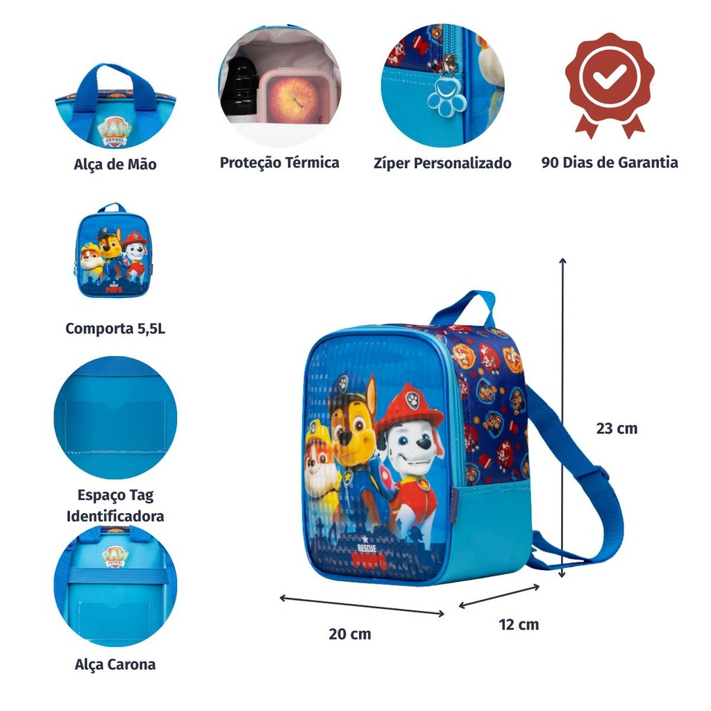 Lancheira Térmica Infantil Masculina Patrulha Canina Chase e Equipe Azul