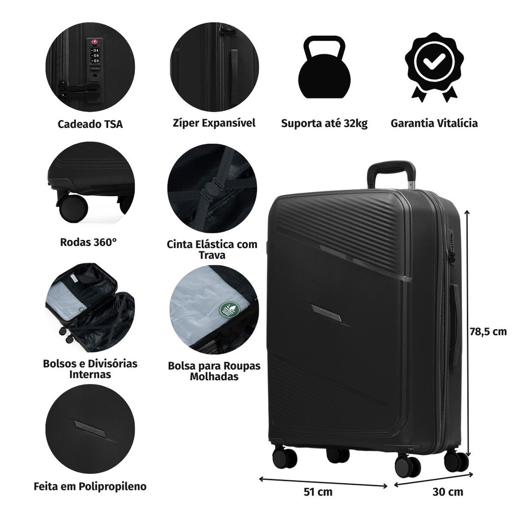 Mala de Viagem Grande 32 Kg Polipropileno 4 Rodas Seul Preta
