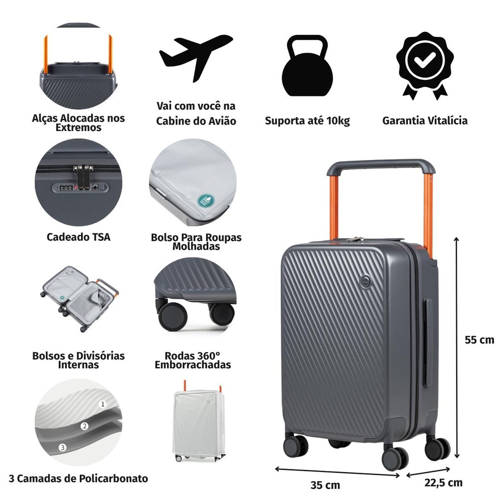 Mala De Bordo Policarbonato 4 Rodas Bahamas Cinza Escuro